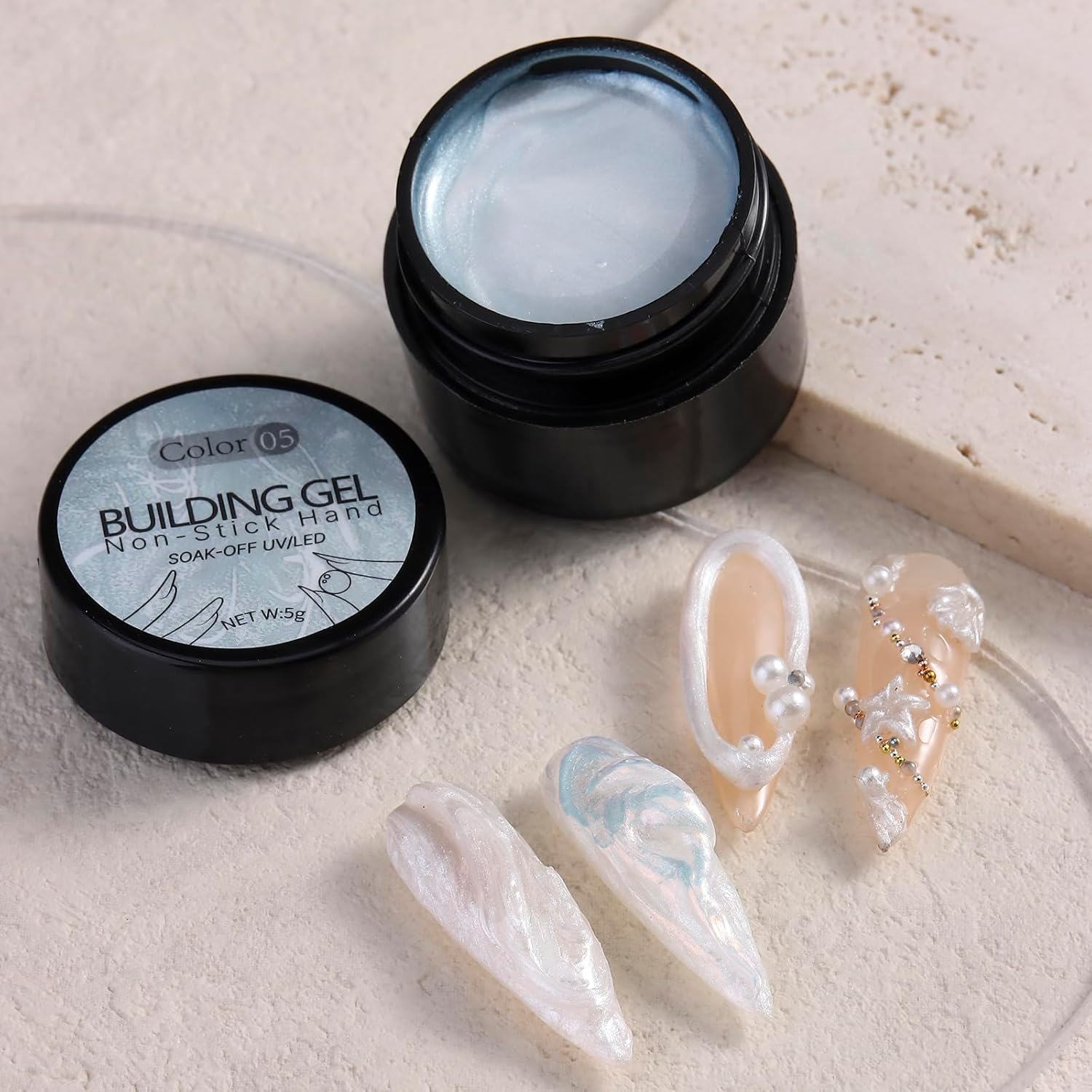 • 【You Will Get】 6 colors (5g for each color) iridescent aurora mermaid solid builder gel for nails, 2pcs dual tipped silicone nail art sculpture pen and 5pcs acrylic sticks.