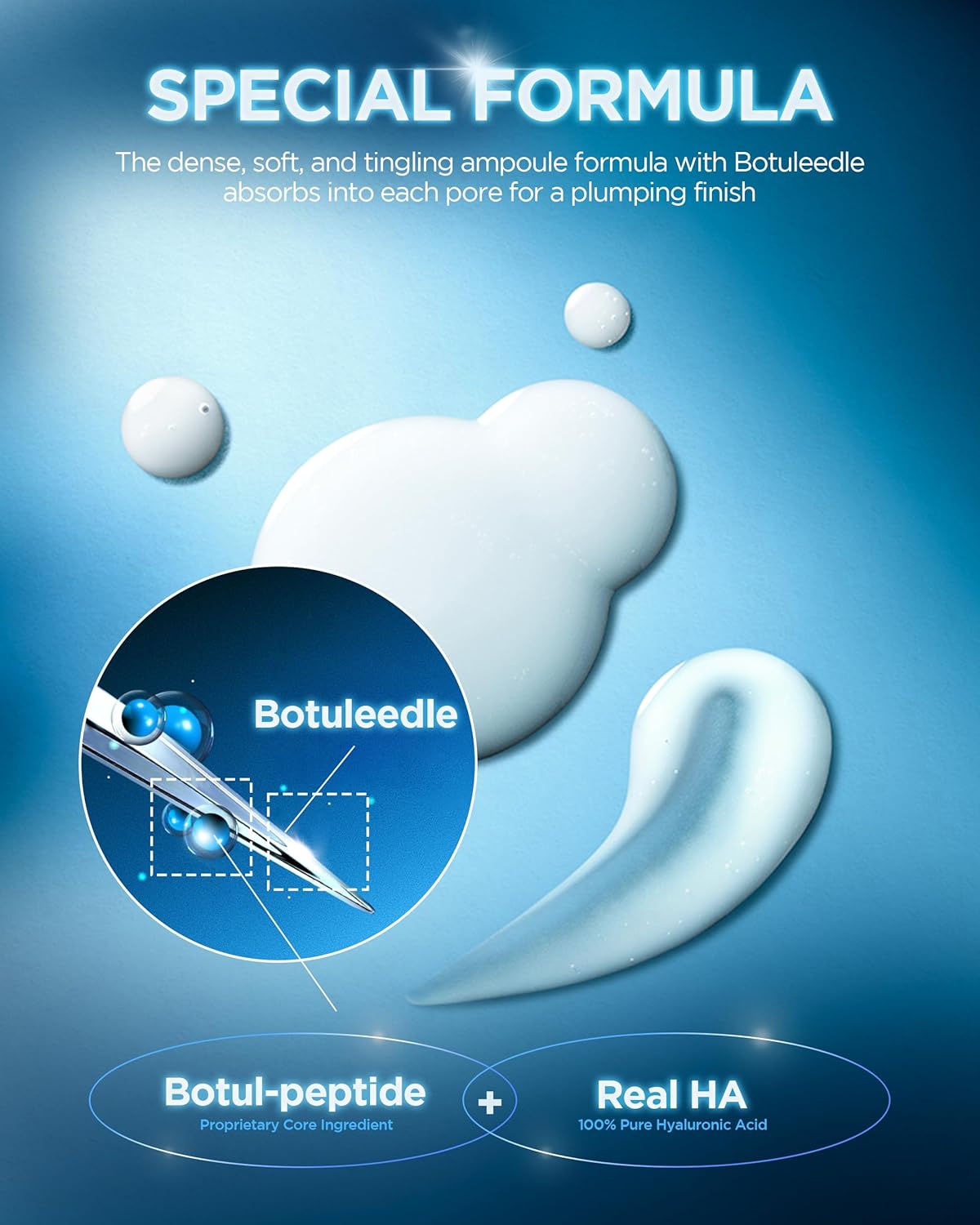 • BOTUL-PEPTIDE POWER — Features 50,000ppm ultra-low molecular hyaluronic acid, PDRN, Panthenol, and Squalane. This high-purity formula plumps skin, tightens pores, and delivers deep hydration for smoother texture.