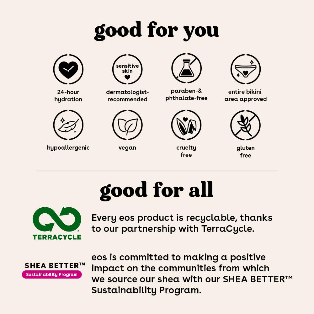 • ALL-NATURAL SHEA BUTTER: eos vegan shave creams have wild grown, sustainably sourced 100% natural shea butter to make your skin feel moisturized, protected, and soft. eos shave cream + lotion are paraben, phthalate and gluten-free. Leaping bunny certified. No products tested on animals.
