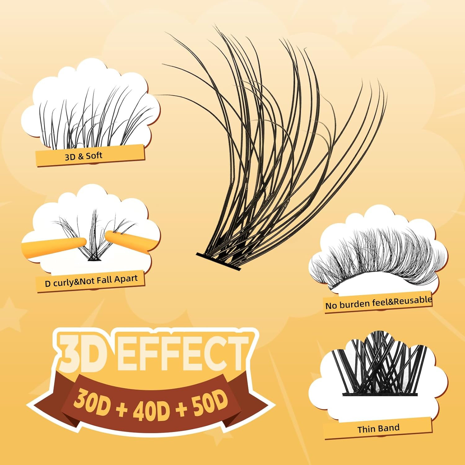 QUEWEL DIY-Lash-Extension-Kit, 3D Lash-Clusters-Kit with 280PCS 30+40+50D Lashes Clusters Mixed 10-16mm Eyelash Clusters, Lash Bond and Seal, Eyelashes Tweezers DIY at Home(3D 30+40+50 KIT)