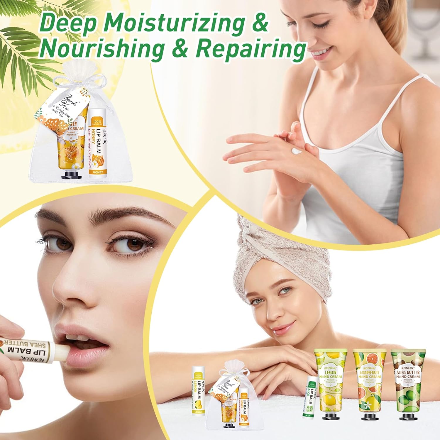 • 【Moisturizing and Nourishing】Hand cream and lip balm is rich in essence,coconut oil,shea butter and Vitamin E,hand cream and lip balm is very effective for dry cracked hands and lip,regularly applying these hand creams can keep your hands smooth and hydrated