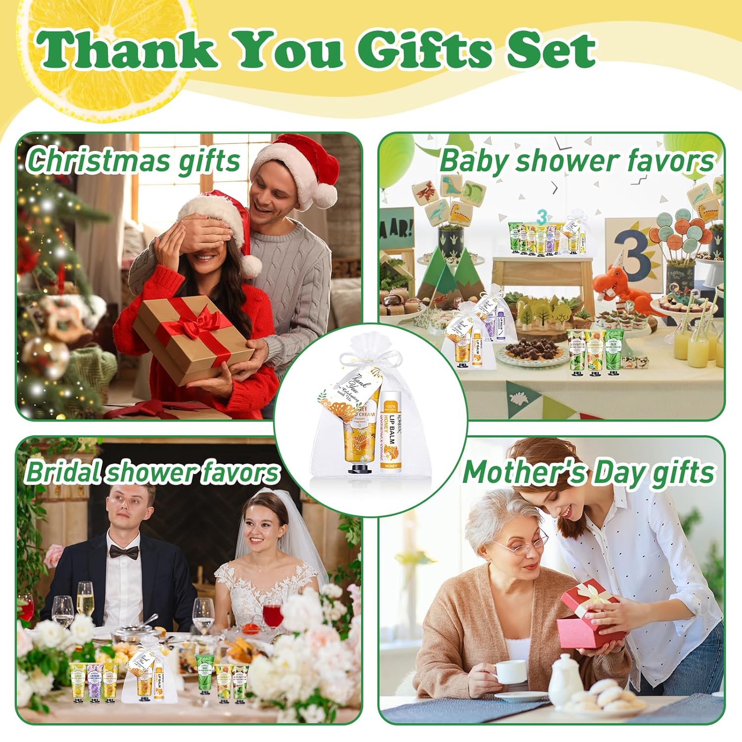 • 【36 Sets Thank You Gifts 】This thank gifts set includes 36pcs hand cream with 6 scents,36pcs lip balms with 6 scents,36pcs organza gift bags,36pcs thank you cards and 1pcs operation instruction.DIY exquisite gift sets and ample quantity,thank you to the guests who celebrate with you