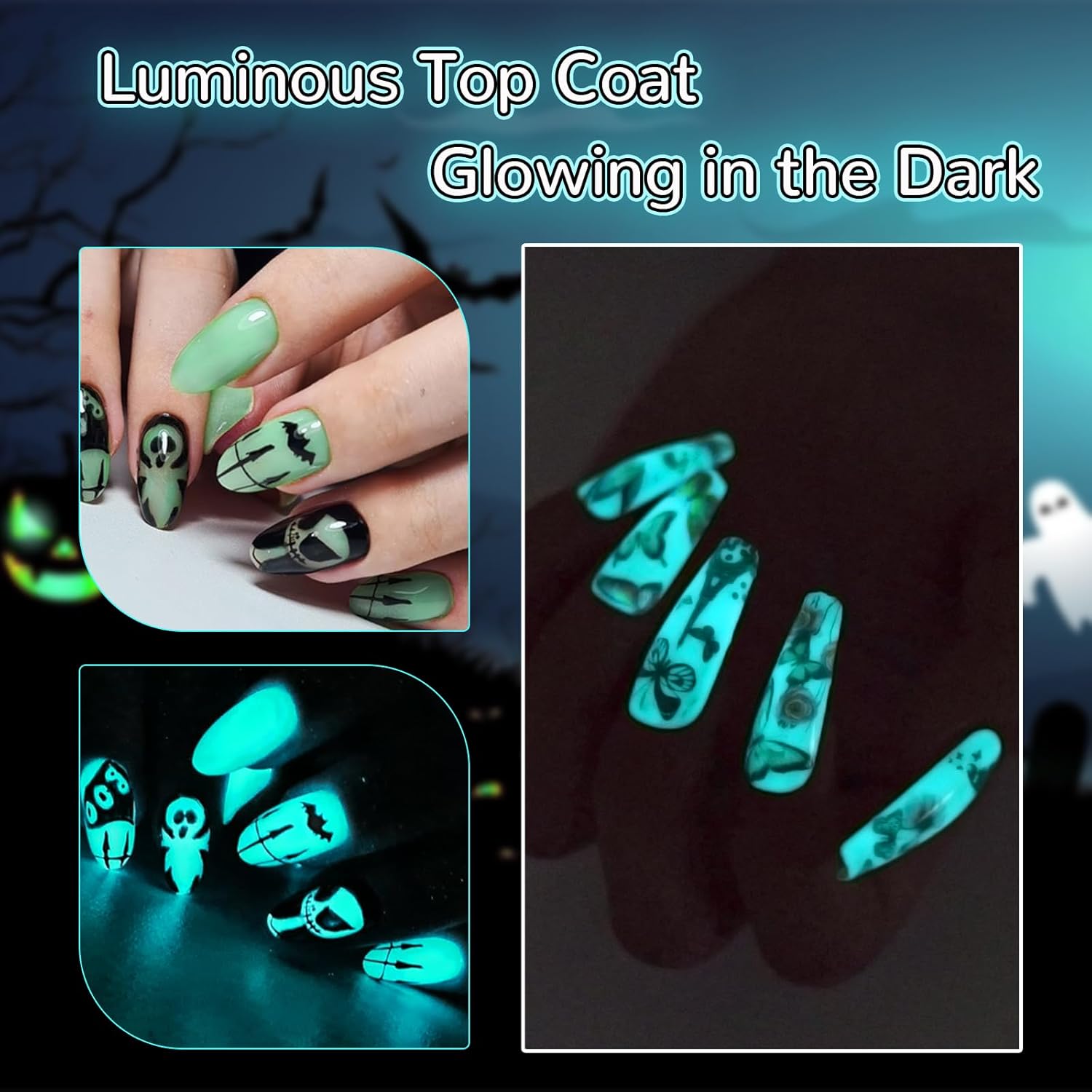 • How Glow-in-the-dark Top Gel Works:The glow-in-the-dark material in the top gel product absorbs energy when it is exposed to light(natural light or UV light)and is able to emit glow-in-the-dark light in dark environment, realizing a unique visual effect