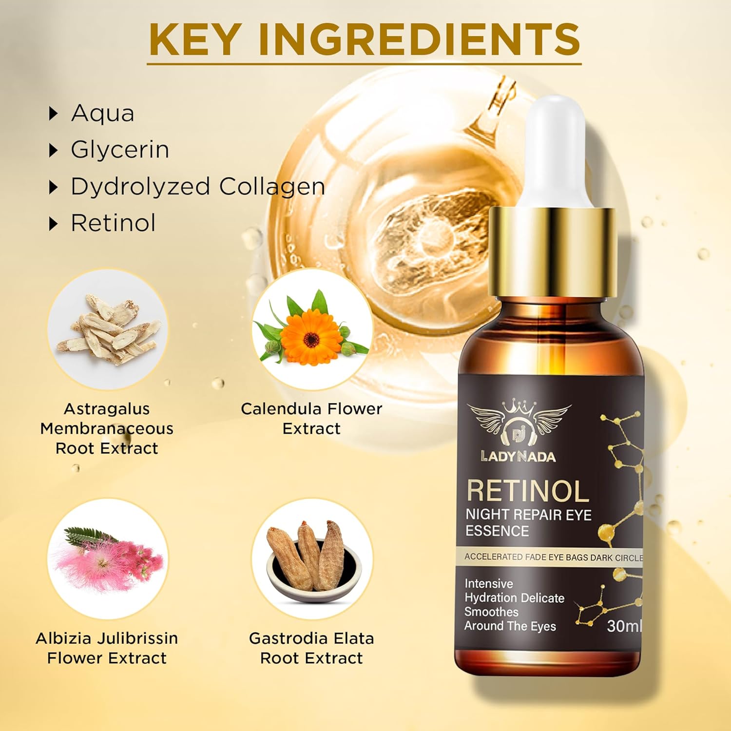 • ✅ 1. INSTANT OVERNIGHT EYE REPAIR Wake up to visibly brighter, smoother eyes! Our retinol eye serum targets dark circles, under-eye bags, and puffiness while you sleep — for a refreshed, energized look every morning.