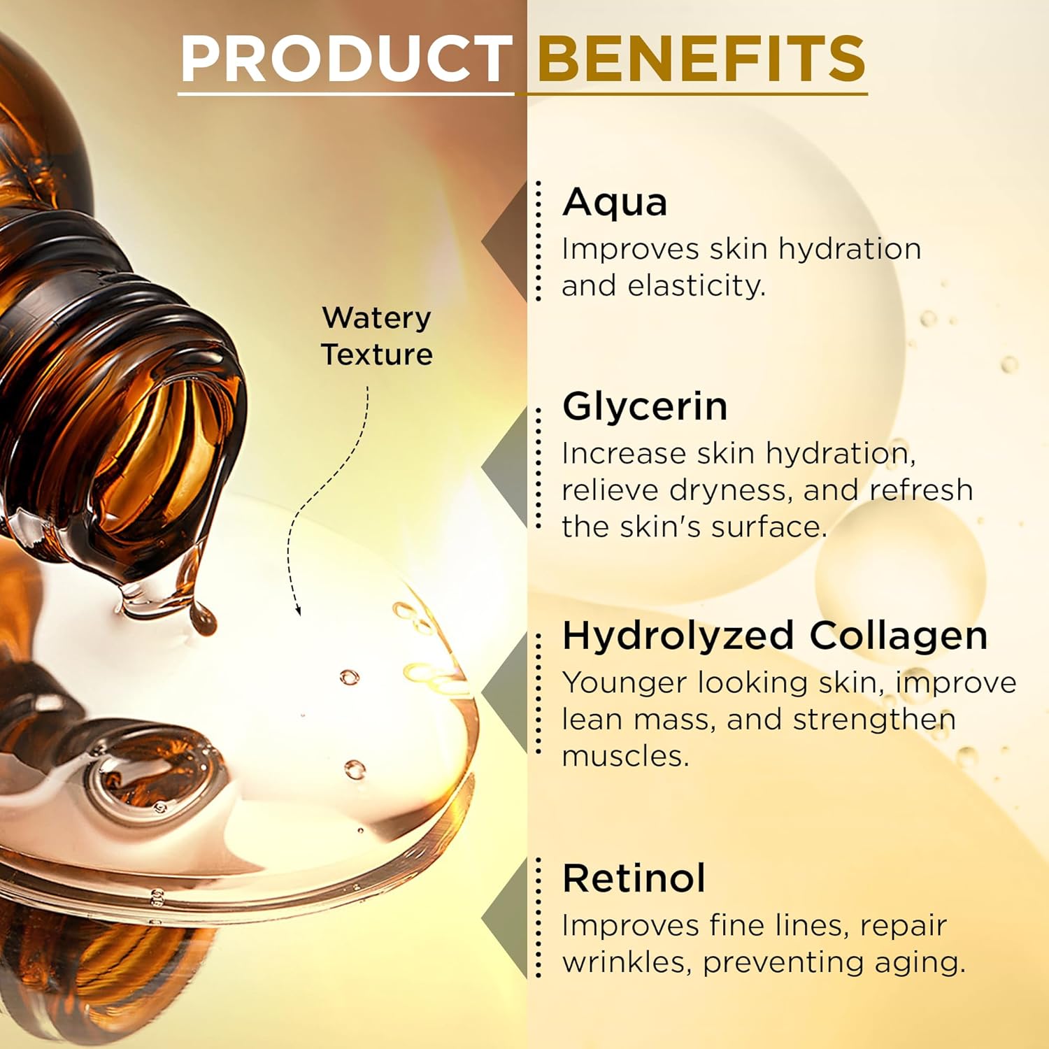 • ✅ 2. POWERFUL & GENTLE FORMULA Formulated with Retinol, Hydrolyzed Collagen, and Hyaluronic Acid, this serum delivers deep hydration without irritation. Perfect for all skin types — even sensitive.