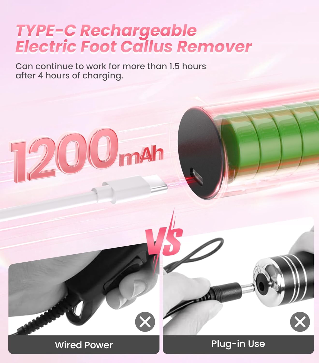 • [POWERFUL BATTERY LIFE] Our electric foot file comes with a 1200mAh battery that lasts more than 1.5 hours of working time after 4 hours of charging. This portable pedicure stone grinder doesn't need to be plugged in to use, you can experience pedicure anytime, anywhere, it's a perfect tool to remove dead skin from your feet quickly and easily.