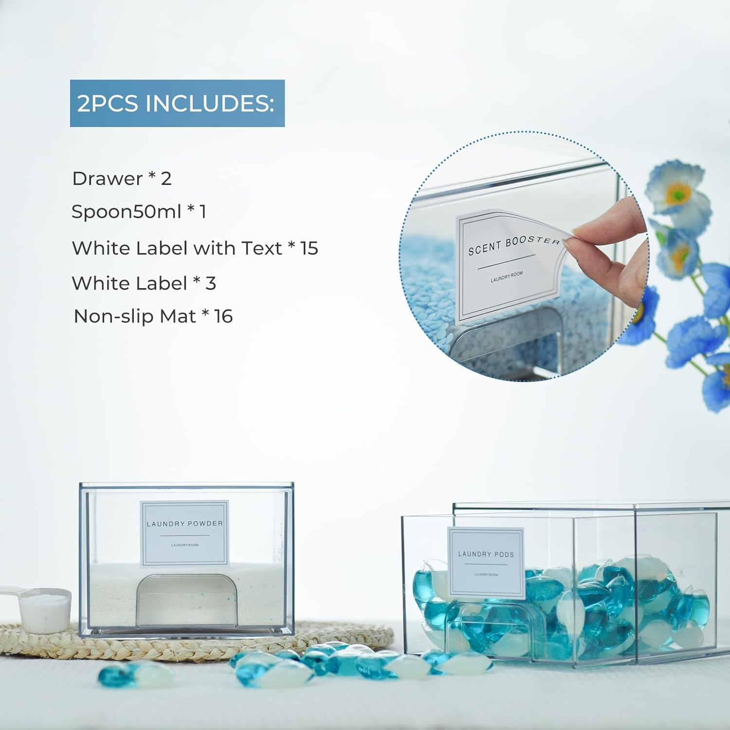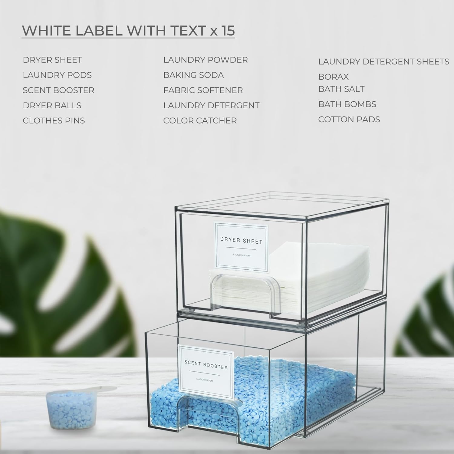 • Labels Included: To further enhance organization, our set of 2 pack laundry containers for organizing includes 18 labels . You can easily label each drawer according to its contents, making it even easier to find what you need. Stay organized and save time with our convenient labeling system. It's also includes 1 scoop specifically designed for measuring out laundry products accurately