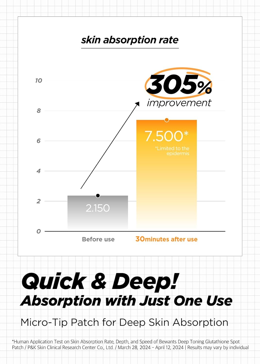 • Effective Skin Enhancement: Bewants Deep Toning Glutathione Dark Spot Patch utilizes advanced micro tip technology to penetrate deeply, enhancing skin elasticity, texture, and tone while reducing blemishes and pigmentation.