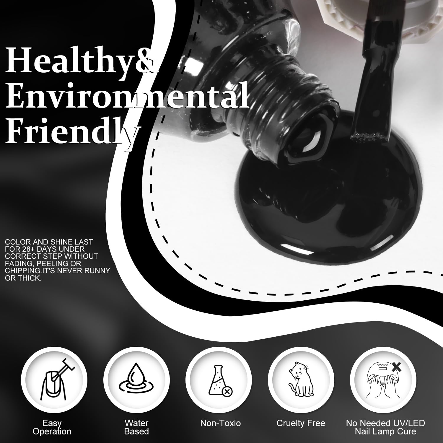 • Non-Toxic and Vegan: Our unique formula is free from harmful chemicals and phthalates, making it a safe and healthy choice for your nails. It helps maintain moisture and gives your nails a glossy finish, with immediate results.