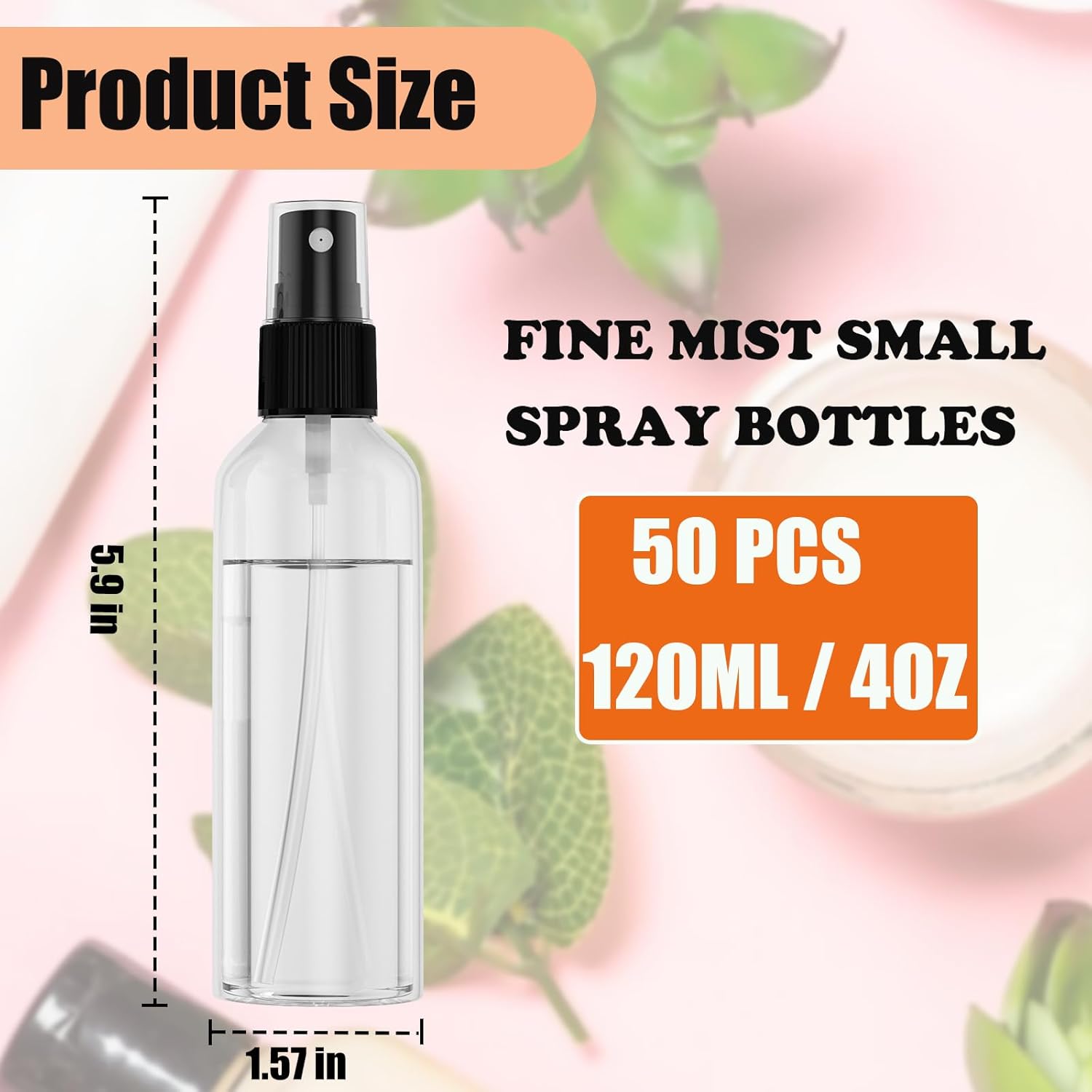 • 4OZ SPRAY BOTTLES PLASTIC FOR PERSONAL DAILY USE AND SMALL BUSINESS: Package includes 50 4 oz. small spray bottles with black mist sprayers; Bulk fine mist spray bottles are perfect for travel,business trips, home and office, and commercial activities; The plastic small spray bottles are not only commonly used for storing personal care liquids and sharing DIY homemade sprays with friends, but also the clear empty bottles are great for small business to make samples! For giveaways or sample sales