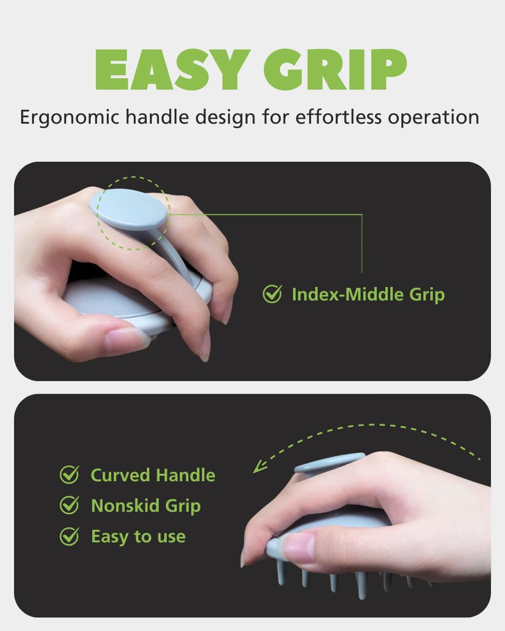 • Ergonomic & Non-Slip Design – Features a comfortable grip handle for easy use in the shower or during dry scalp massage sessions.