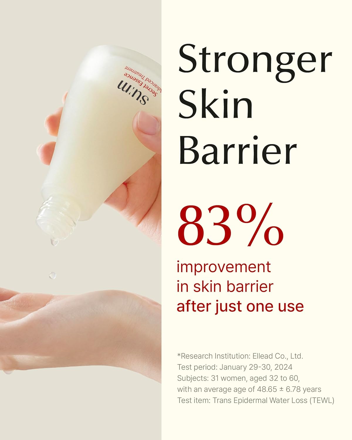 • SU:M SECRET ESSENCE (30ml/1.01fl oz) - This essence deeply hydrates and strengthens the skin's barrier, helping to enhance elasticity, smoothness, and natural vitality for a refreshed and youthful appearance.