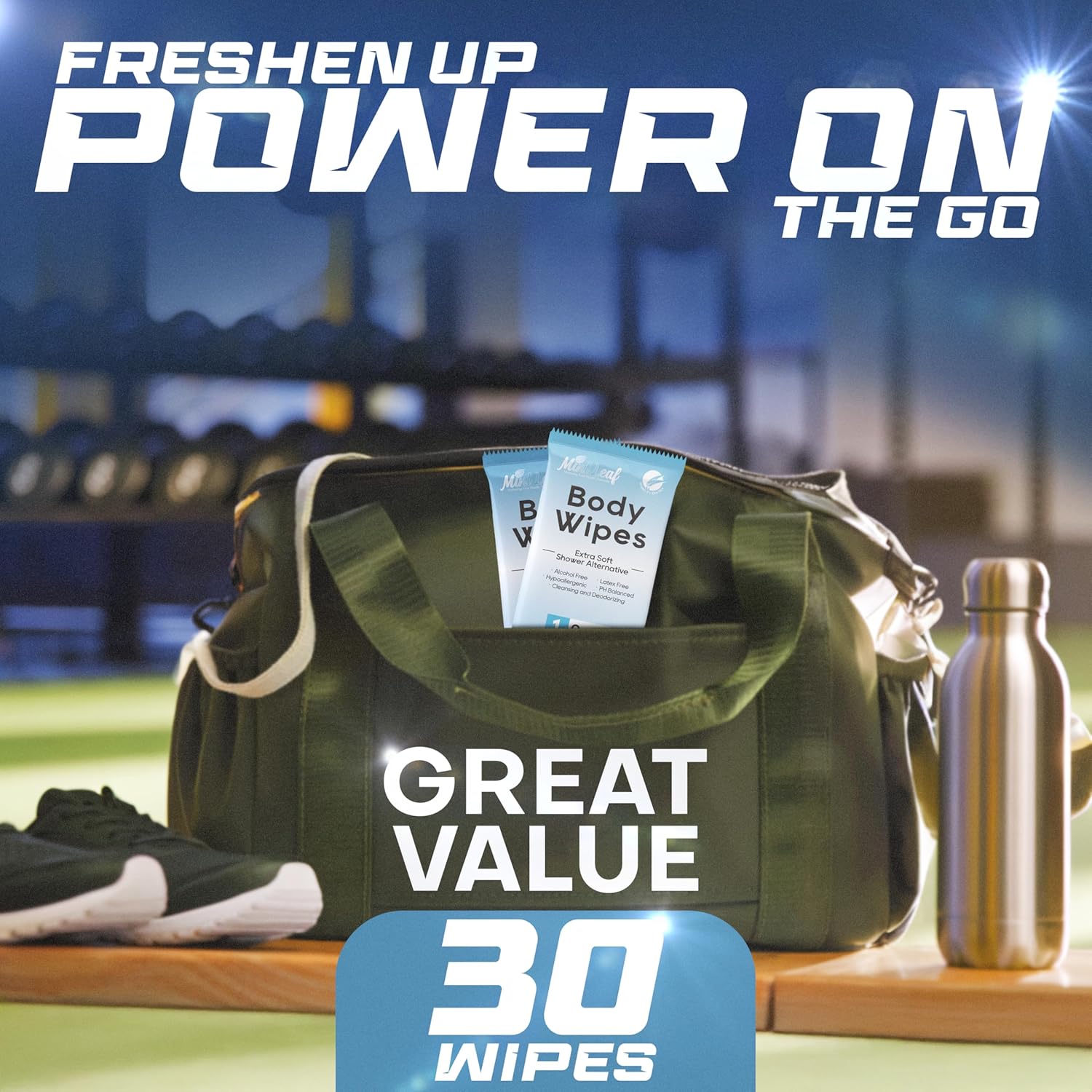 XL Deodorizing Body Wipes | Men's Extra Soft Washcloths Shower Alternative | Great for Workout Travel Gym Camping | 30 Individually Wrapped Shower Wipes | with Vitamin E Aloe Scent