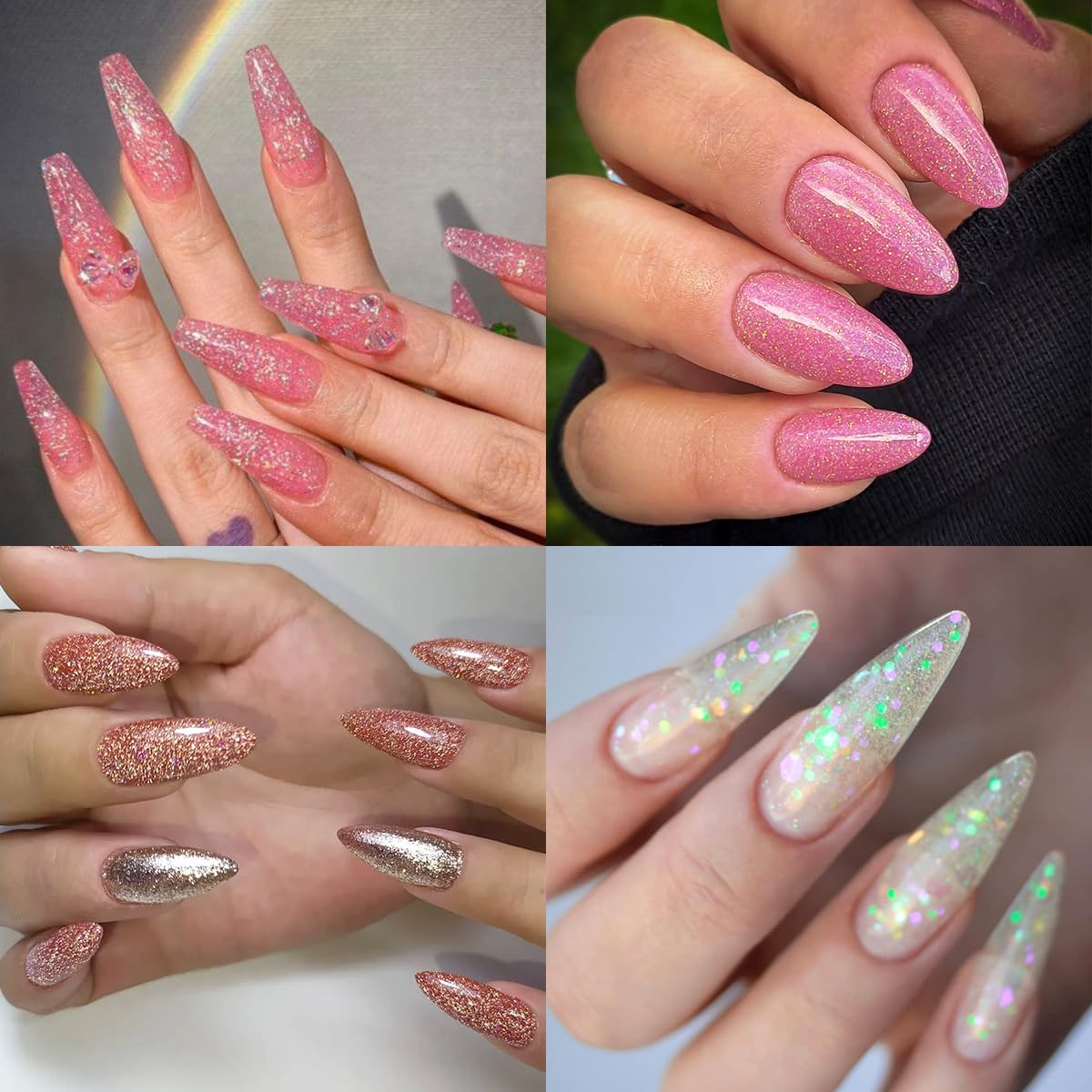 • 【Poly Nail Gel with Glitter 】 The poly nail gel is designed with holographic glitter or iridescent chunky glitter,you can see beautiful shimmer effect on it. It’s suitable for glitter ombre nail design,bling nail art decoration and so on.
