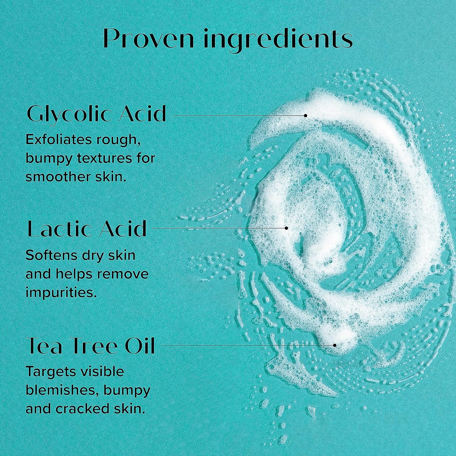 • SMOOTHING CLEANSE: Our glycolic acid body wash exfoliates and resurfaces rough and bumpy texture to reveal softer, smoother skin. The Alpha Hydroxy Acids within this exfoliating body wash prepares your skin for treatment body creams/lotions to effectively be applied by helping to remove the dry, dull skin that builds up on the surface of our skin. Dry skin can act like a shield that prevents active ingredients from penetrating.
