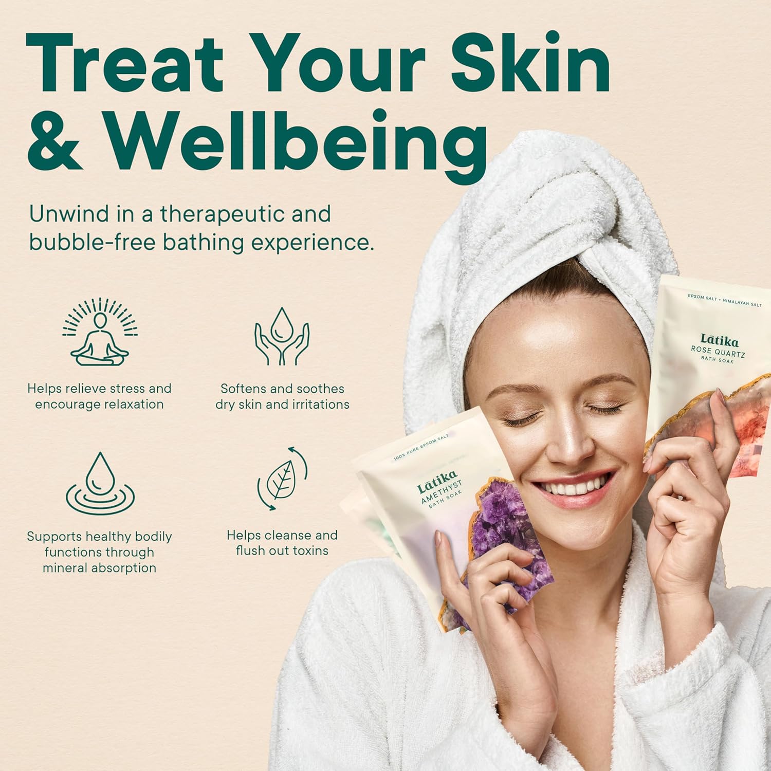 • STRESS RELIEF – Transform your bath into a sanctuary with our Geode-inspired Soak Set of 3, featuring Amethyst, Rose Quartz, and Emerald soaks infused with essential oils like lavender, sage, basil, sandalwood, and eucalyptus. This unique blend of Epsom salt and botanicals is crafted to promote calmness and melt away stress.