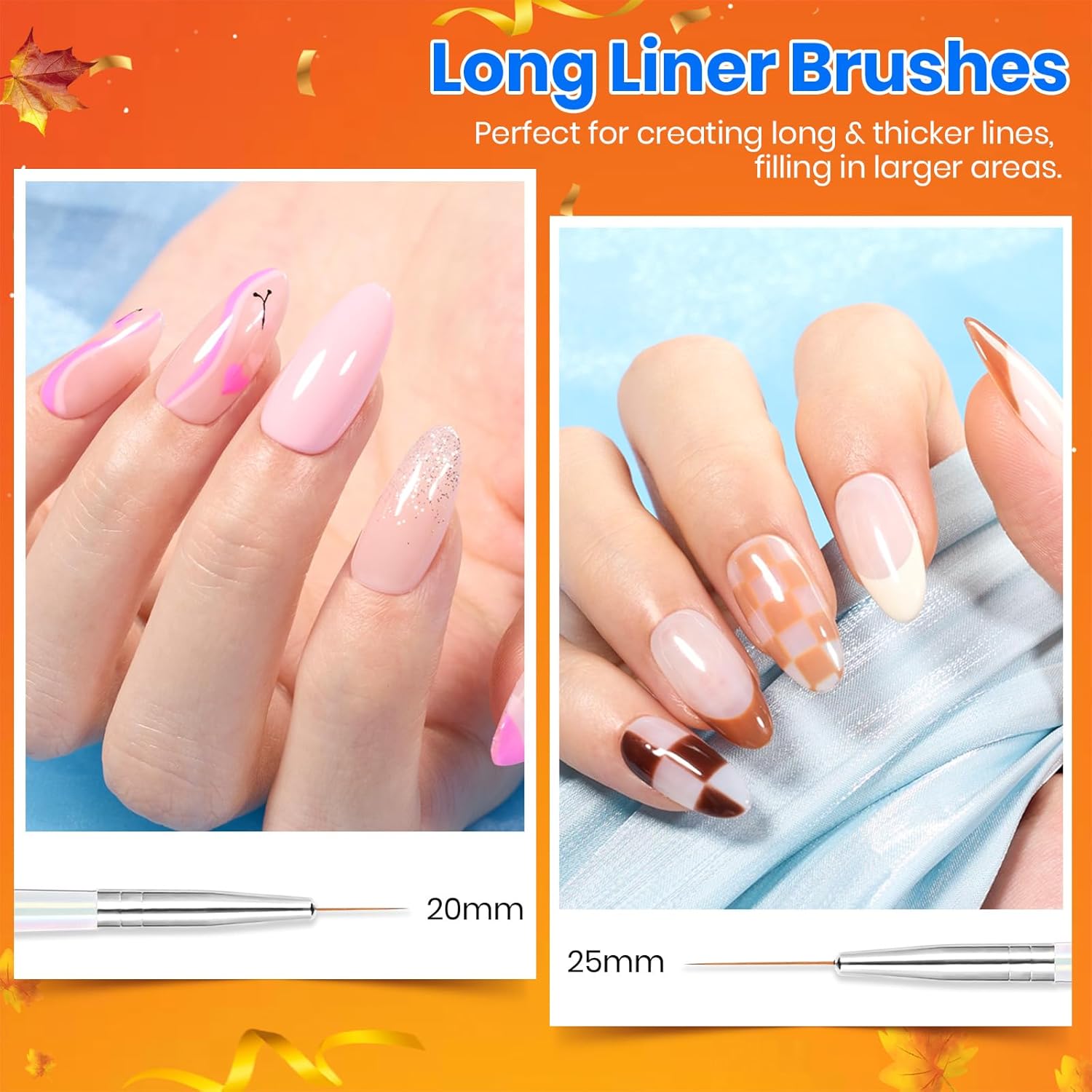 • Variety Lengths: Carefully selected 5 different lengths of liner brushes, including 7mm short brushes, 11mm and 15mm medium-length brushes, and 20mm and 25mm long brushes, specifically designed for nail art enthusiasts to easily tackle fine short lines, complex patterns, 3D nail gel designs, floral and geometric designs, and more.