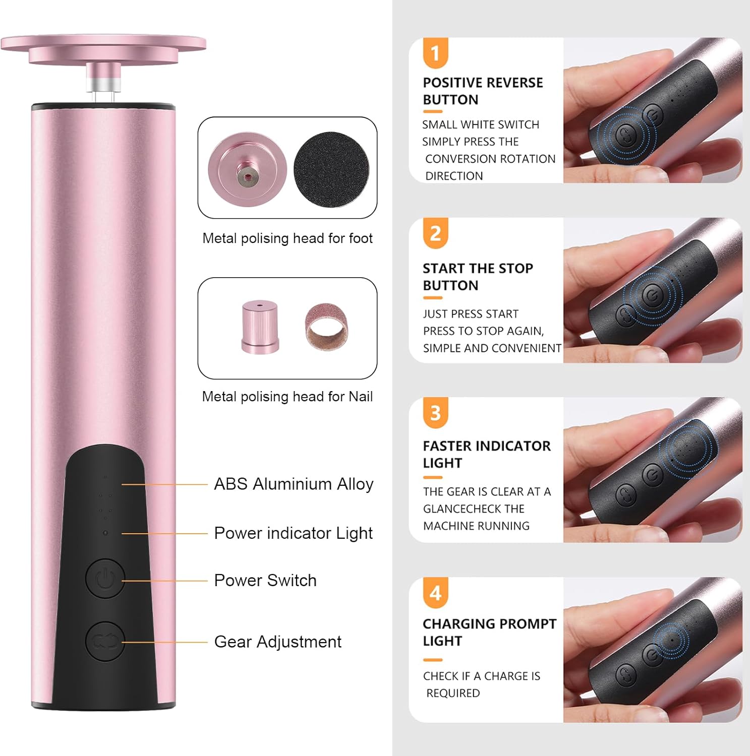 • 【Pedicure and Manicure Care】electric foot file its interchangeable dual heads, which enable the electric foot file to function not only as an efficient callus remover but also as a nail drill. This innovative foot callus remover tool consolidates the tasks of callus elimination and polish nails into a single, multi-purpose tool.