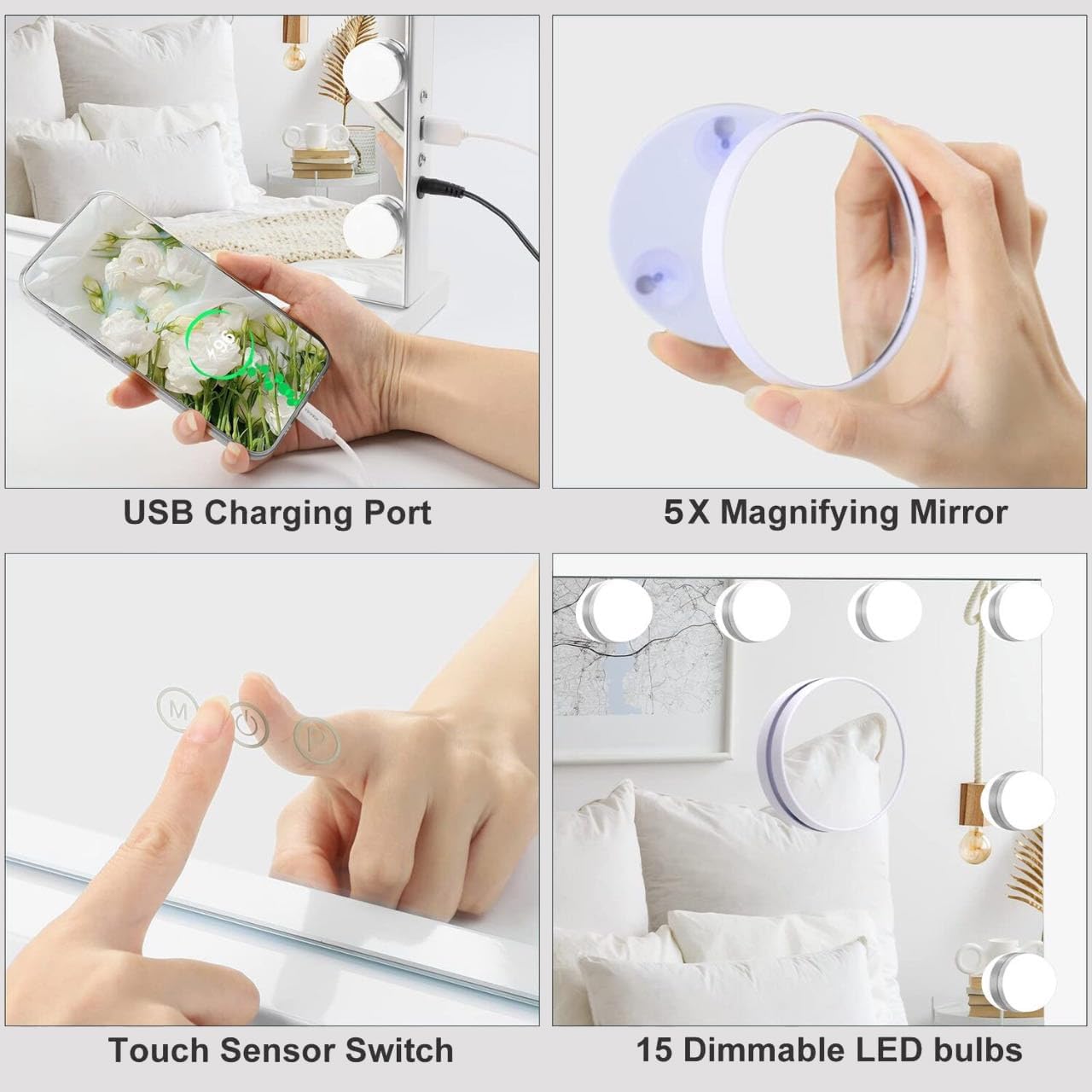 • Vanity mirror with 15 Dimmable Bulbs Lights:12 big bulbs lights along three sides of mirror will provide perfect lighting for makeup application.Made from premium flame retardant metal material and mirror glass,perfect looking and resistance for scratch
