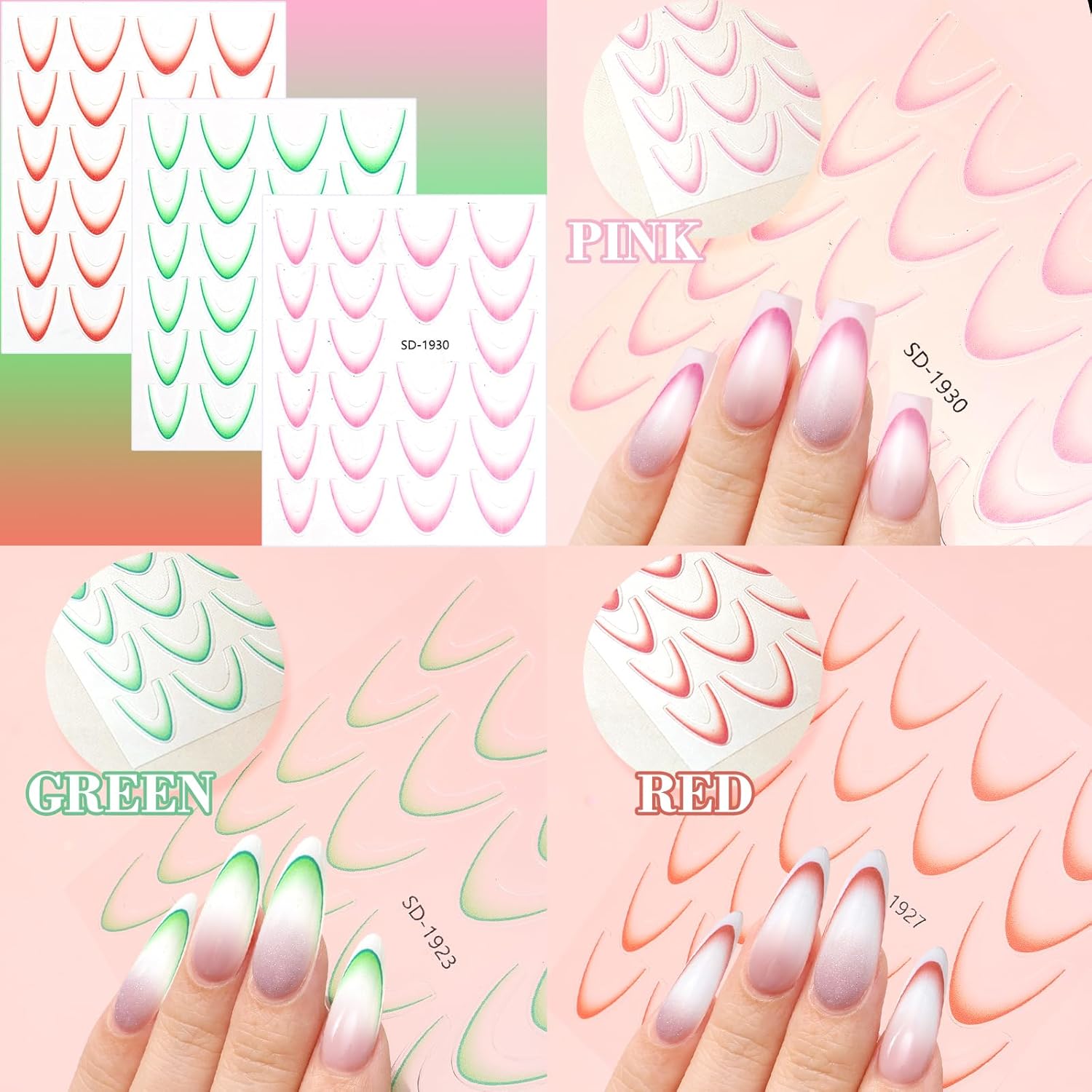 • 【3D Gradient French Tip Stickers】You will receive 12 sheets 3D French nail stickers in different colors, each with French line patterns of different sizes. Gradient French nail stickers and decal stripe designs combine popular elements, with simple design and rich colors, enough to satisfy your various French nail designs.