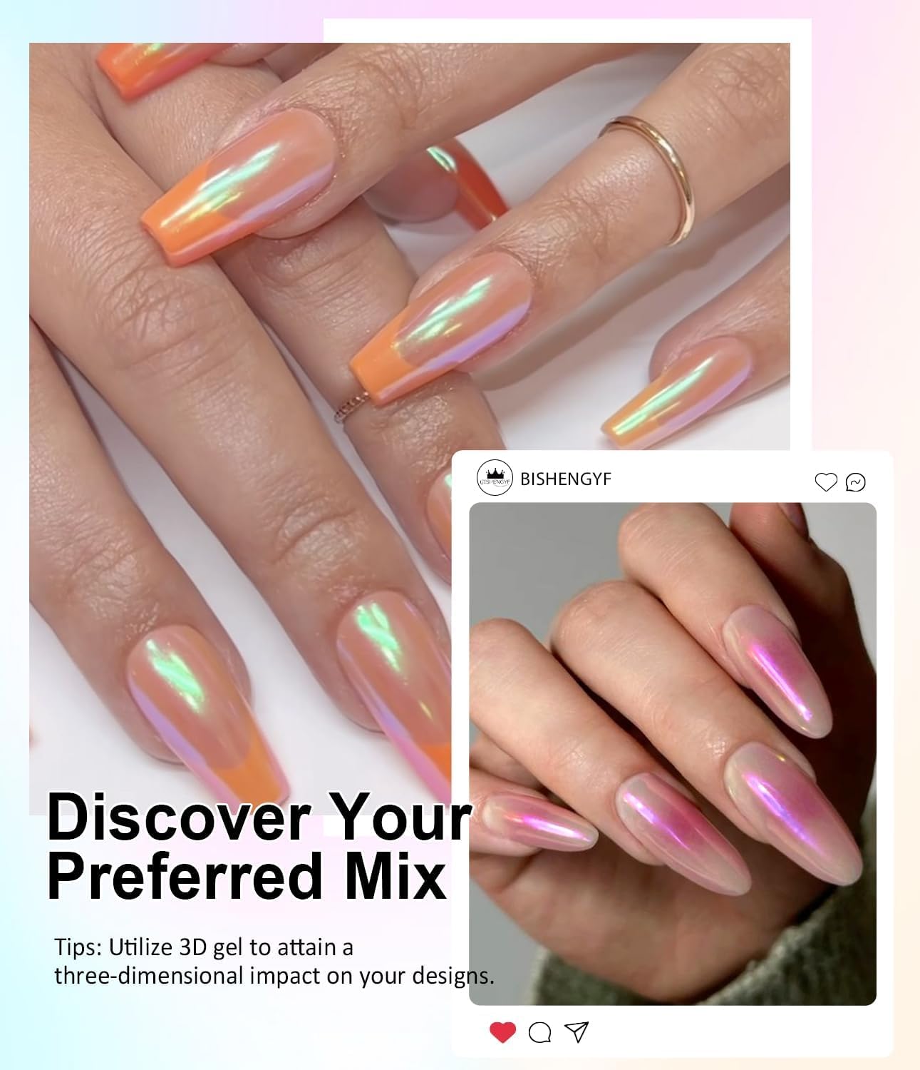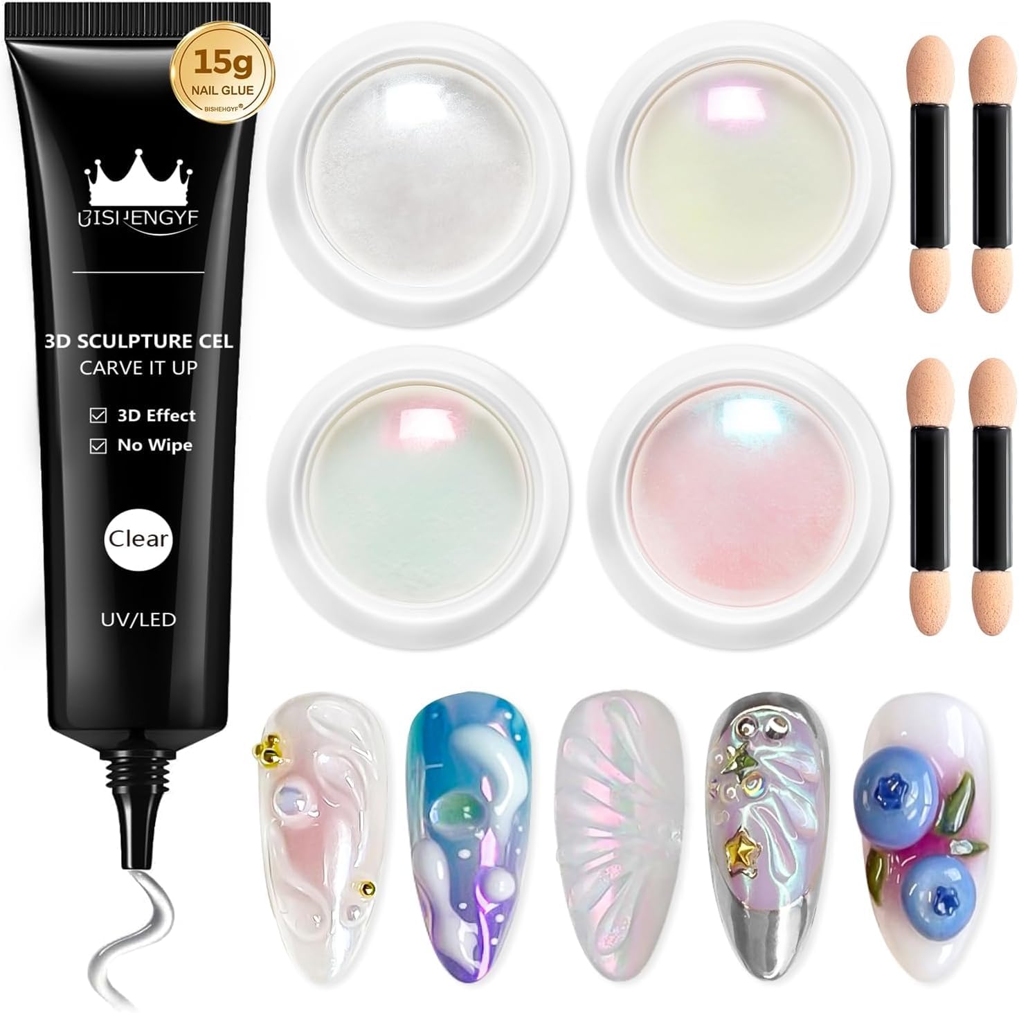 • 3D Nail Gel & Chrome Powder Kit: BISHENGYF upgraded 3D nail art sculpting gel kit include 15g clear nail sculpting gel, mermaid white green purple and pink chrome powders, and sponge sticks. Friendly for nail beginners and nail lovers, allows nail art beginners to create stunning nails at home and DIY enthusiasts for 3D gel nail art sculpture.