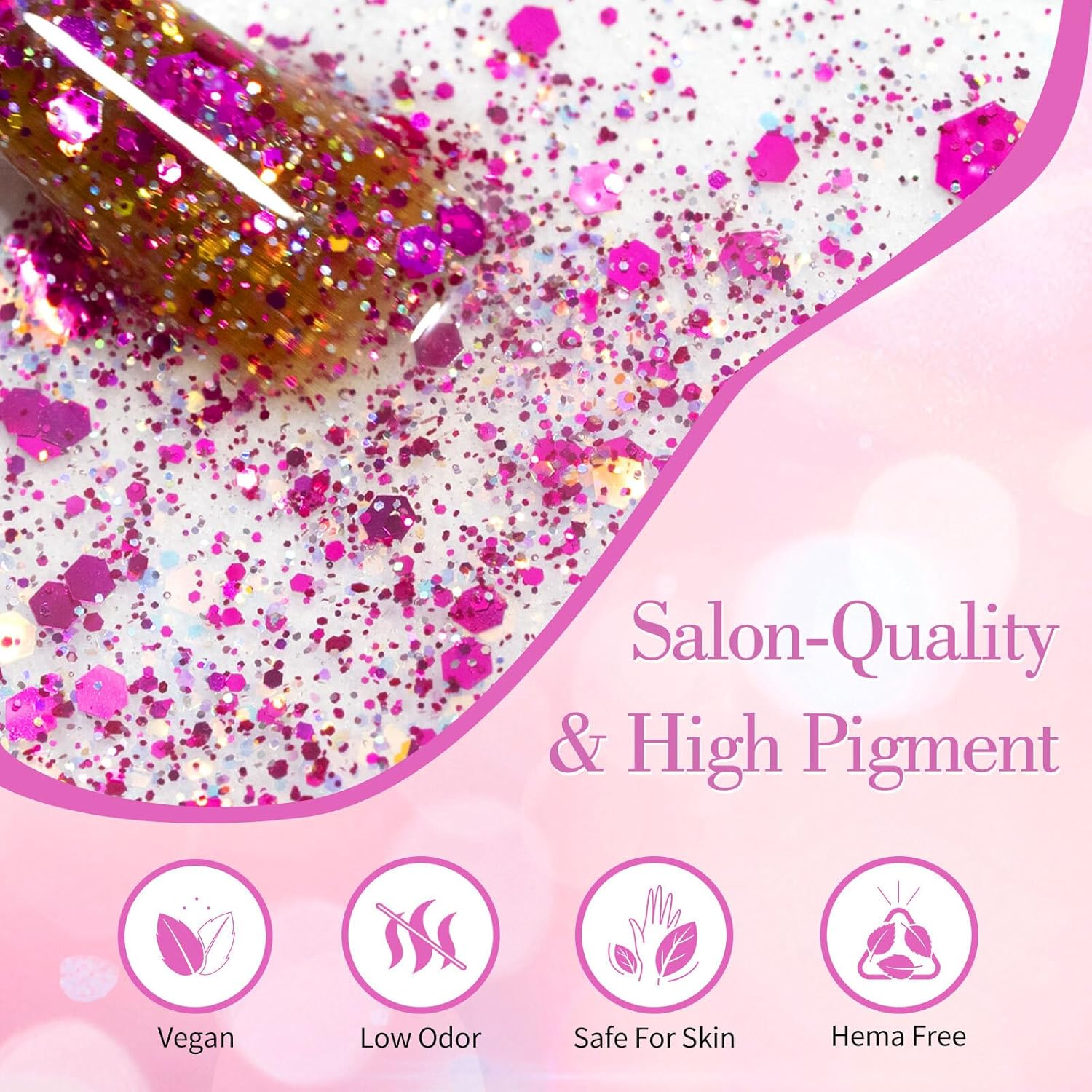 • Long-Lasting Durability: Designed for extended wear, this glitter gel polish is chip-resistant and maintains its vibrant shine for up to three weeks