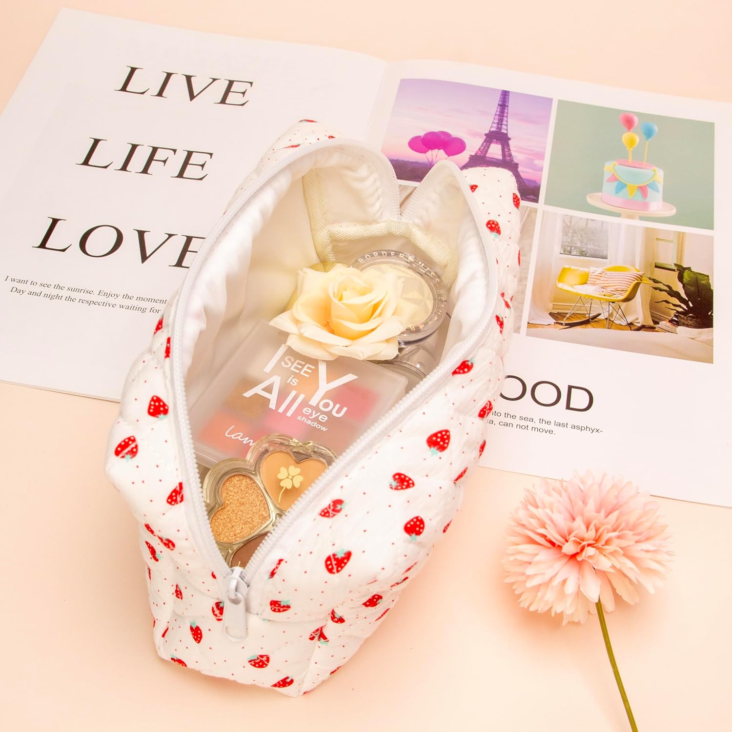 PAZIMIIK Vintage Quilted Makeup Bag Cosmetic Pouch for Brushes Pencils and Travel Make Up Accessories for Women and Girls Strawberry