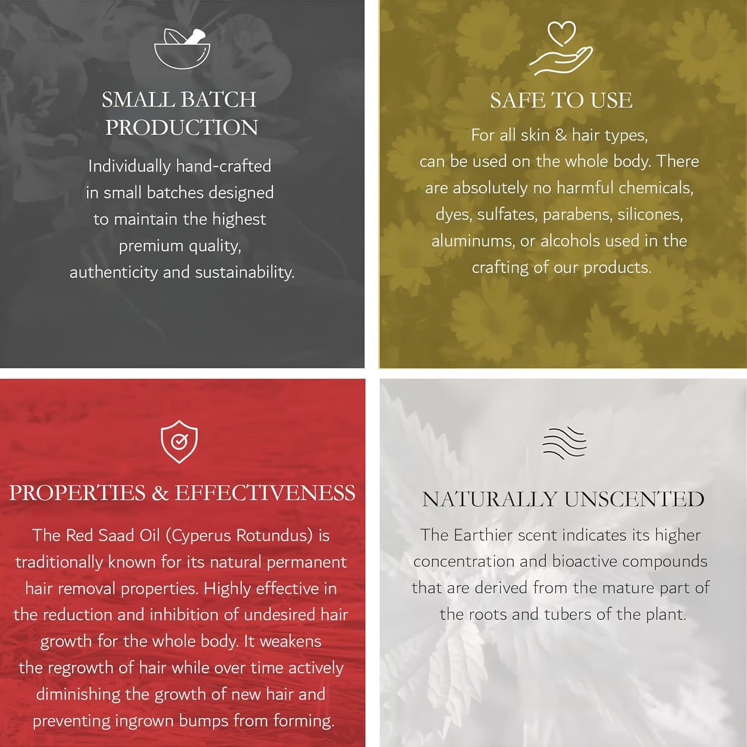 • PROPERTIES AND EFFECTIVENESS: The Red Saad Oil (Egyptian Cyperus Rotundus) is traditionally known for its natural hair removal properties. Highly effective in the reduction and inhibition of undesired hair growth for the whole body. Weakens the regrowth of hair while over time actively diminishing the growth of new hair and preventing ingrown bumps from forming. Noticeable effects within the 1st week when used as directed.