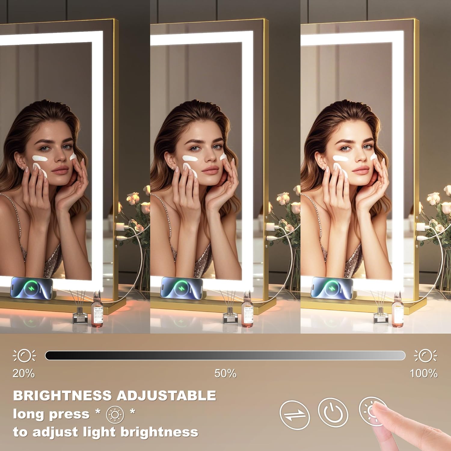 • 👍【Smart Touch Control & Memory Function】This makeup mirror with lights has 3 smart touch buttons, turn on/off the light by touching the sensor switch, Press left button to change the color modes, long press right button to adjust the led brightness. This lighted makeup mirror is specially designed memory functionfunction keep your lights setting like your last use.