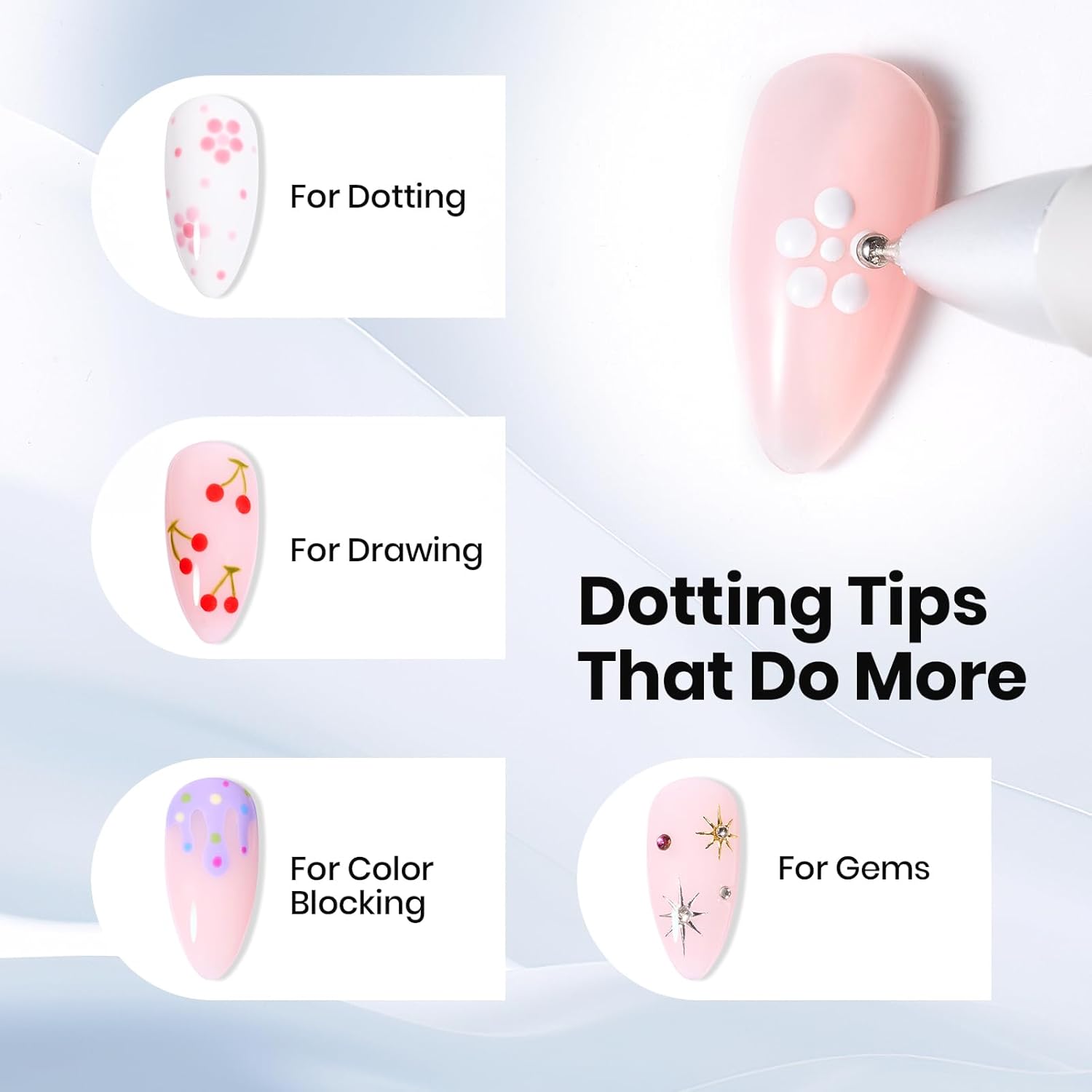 • Ergonomic Design for Effortless Artistry: Dotting tools nail art engineered with an adjustable switch for quick tip changes, a non-slip silicone grip, and an anti-roll body, the pen ensures hassle-free, precise control. Nail Dotting Tools perfect for all mani nail art design: Gel Polish, Acrylic Powder, Nail Extension Gel, Dip Powder, Press-on Nails, and False Nail Tips