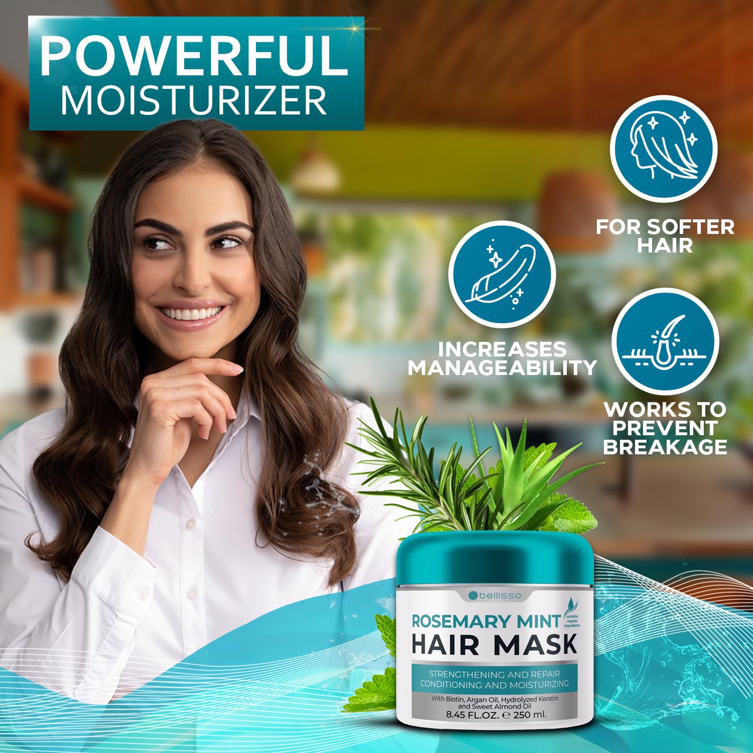 • SLEEK AND SHINY: Take back control of your appearance with hair care products that leave your locks looking shiny. Bellisso’s hair treatment for dry damaged hair not only delivers intense moisture, but also helps you achieve dazzling shine. No more out of control frizz, just gorgeous hair that gets attention for all the right reasons with our rosemary and mint hydrating hair mask.
