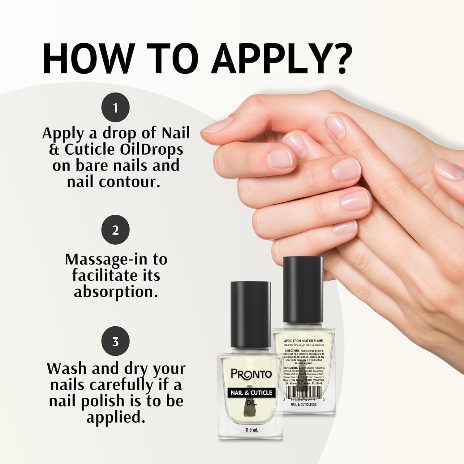 • PREMIUM QUALITY PRODUCT: Our Pronto fingernail polish remover & cuticle drop duo are proudly made in USA, using 100% pure acetone to effectively and efficiently remove all types of manicure and pedicure and cuticle oil to help deeply nourish and protect nails.