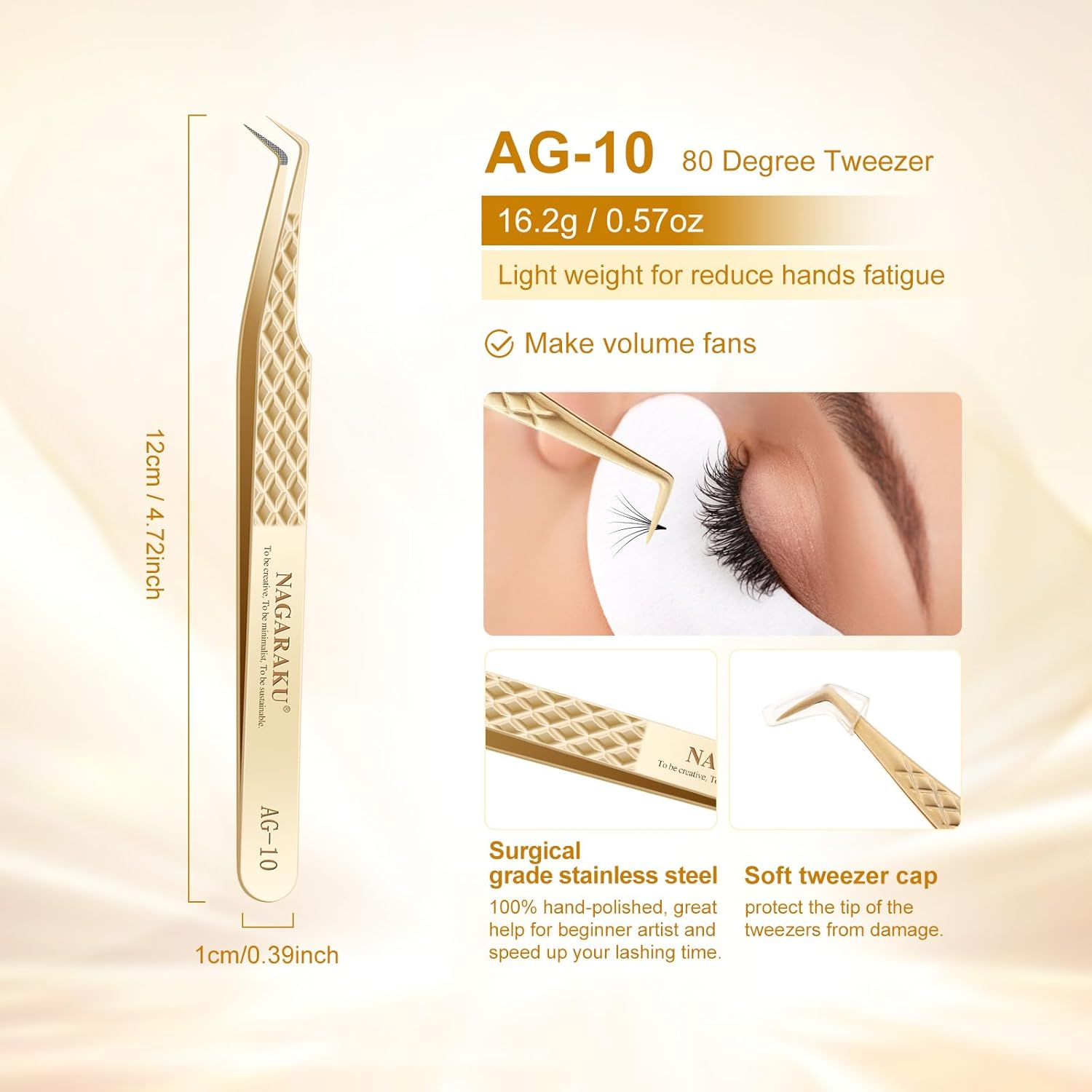 • 80 Degree Tweezer AG-10: Color: Gold / 4.45 inches; Width: 0.39 inches. These handcrafted tweezers are made of high-strength stainless steel, which is resistant to most acids and other corrosive agents. We give each tweezer a box to protect the tweezers