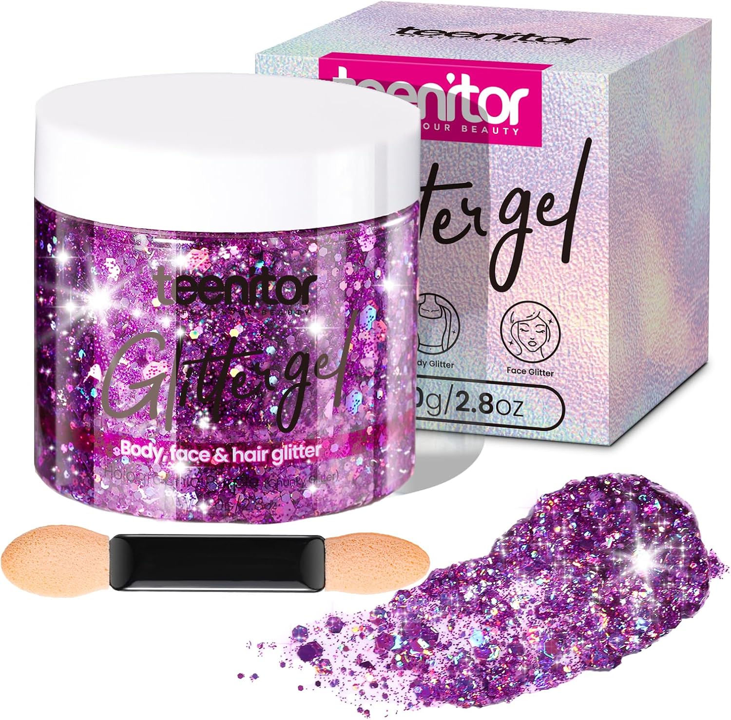 Teenitor Body Glitter, Face Glitter, Hair Glitter Gel, 80g/2.8oz Makeup Rave Purple Glitter Gel for Face and Body