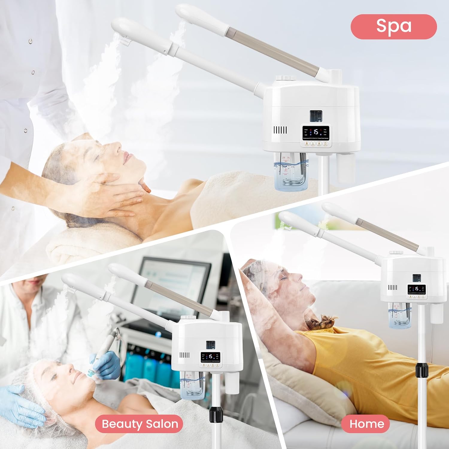 • 【Facial Steamer Professional】Our 2-in-1 facial steamer comes with upgraded misting cartridge, time setting function, removable 650ml water cup, waste water collector, a scent box, 36-51 inches of adjustable height, 360° rotating nozzle, and 360° rotating body.