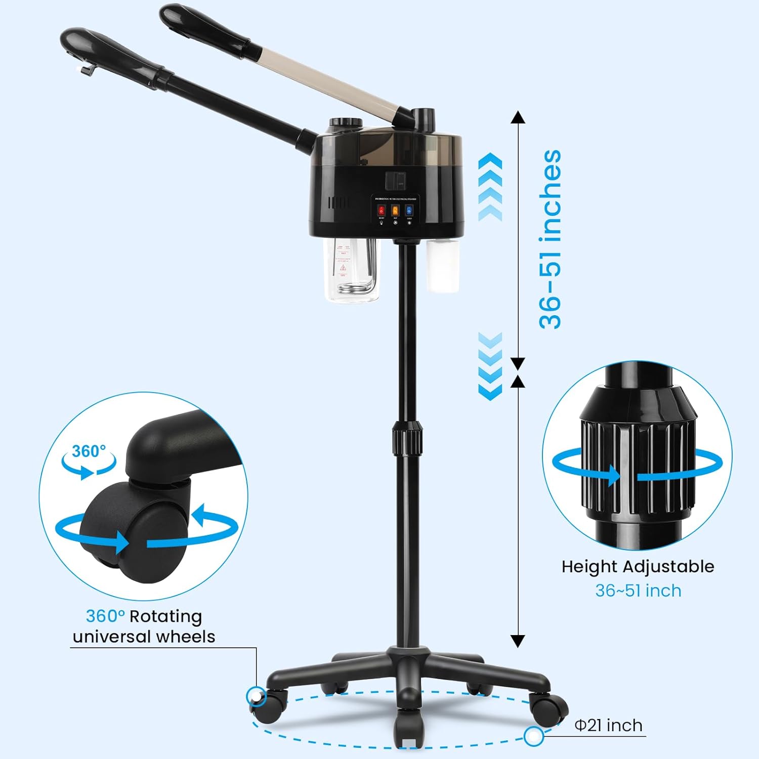 • 【Facial Steamer Adjustable】The height of this professional facial steamer can be adjusted from 36~51 inches, 360° rotatable nozzle, 360° rotatable main body, Keep the nozzle at least 25~30 cm (9~11 inches) away from your face, when using and the best steaming time is 15-20 minutes.
