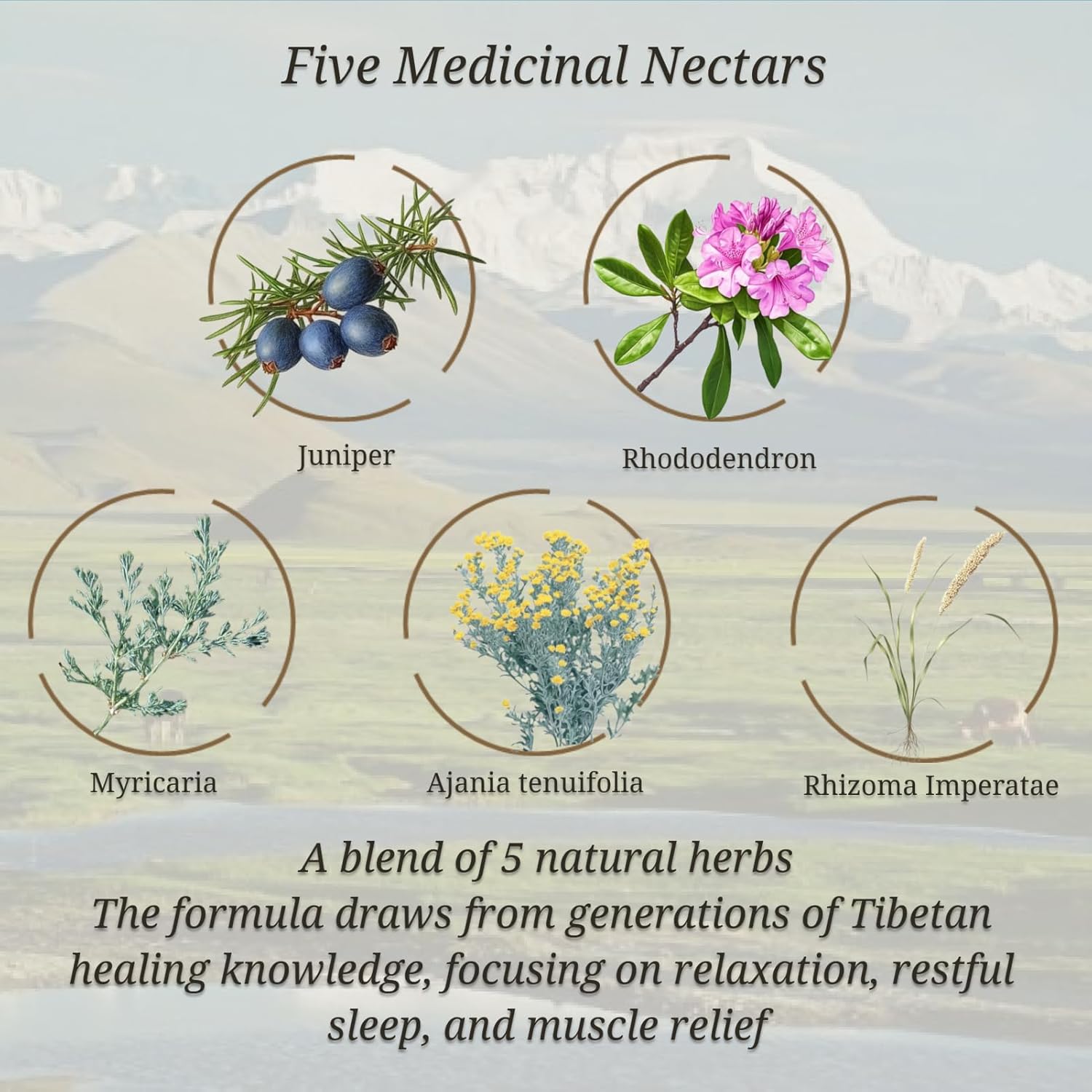 • Natural Ingredients: Made with Tibetan natural botanicals and premium ingredients. The formula is called "The Five Medicinal Nectars". It draws from generations of Tibetan healing knowledge, focusing on relaxation, restful sleep, and muscle relief.