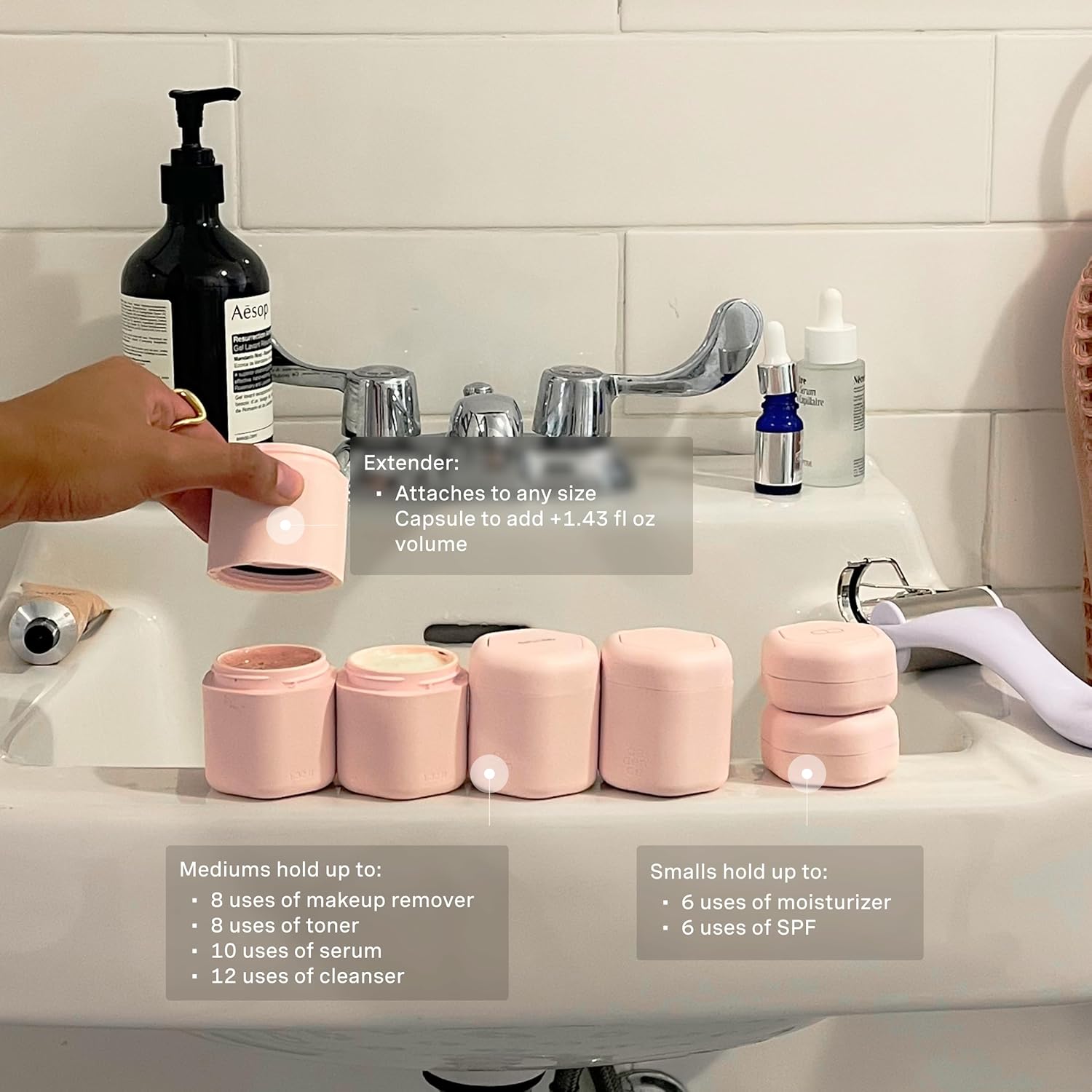 Cadence Travel Containers - Full Skincare Set - Magnetic Containers with Lids,Carry On Travel Essentials For Women/Men - 2 Small (0.56oz), 4 Medium Capsules (1.32oz), & Extender (1.43oz) - Petal