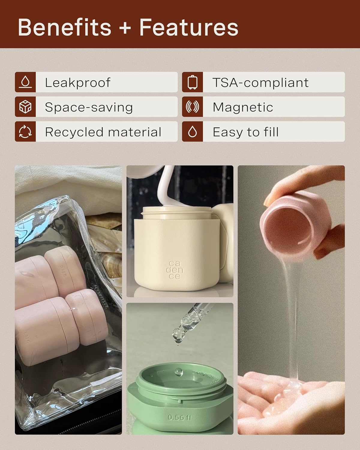 • OFFICIAL CADENCE DESIGN - Meet the Cadence Basic Skincare Capsule Set, the ultimate travel essentials for women and men who want to keep skincare products neatly stored. These reusable capsules for travel toiletries comes with a labeled tile: cleanser, moisturizer, and a sun icon.