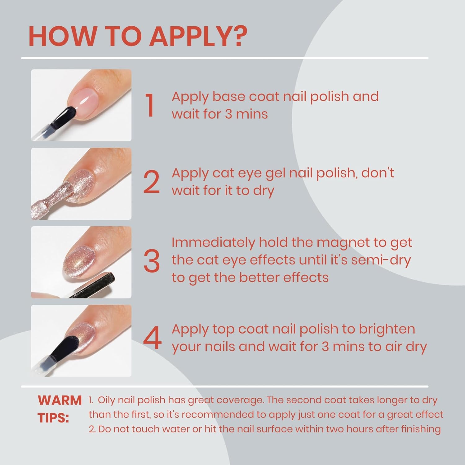 • Important Tips: 1. When the nail polish is not dry yet, it will be fluid. Use magnets to hold it in place until it's semi-dry, then take them off for a sharp cat-eye look 2. Do not touch water or hit the nail surface within two hours after finishing to avoid peeling; 3. Base and top coat nail polish art necessary
