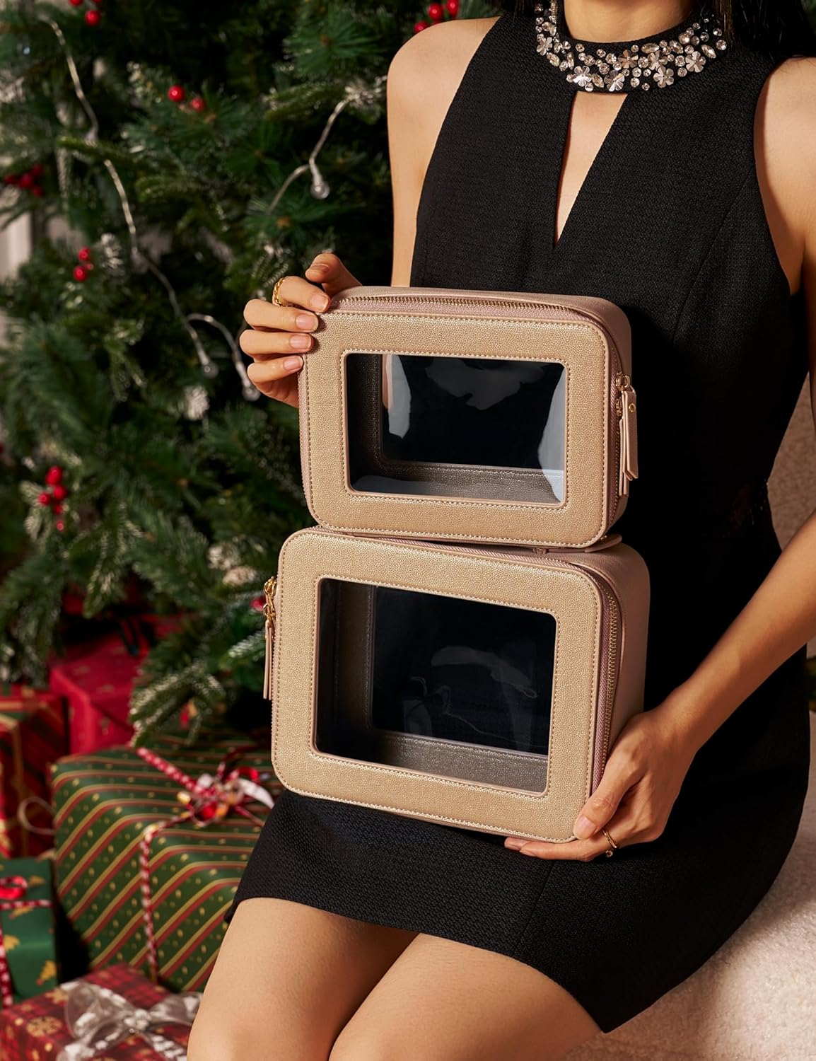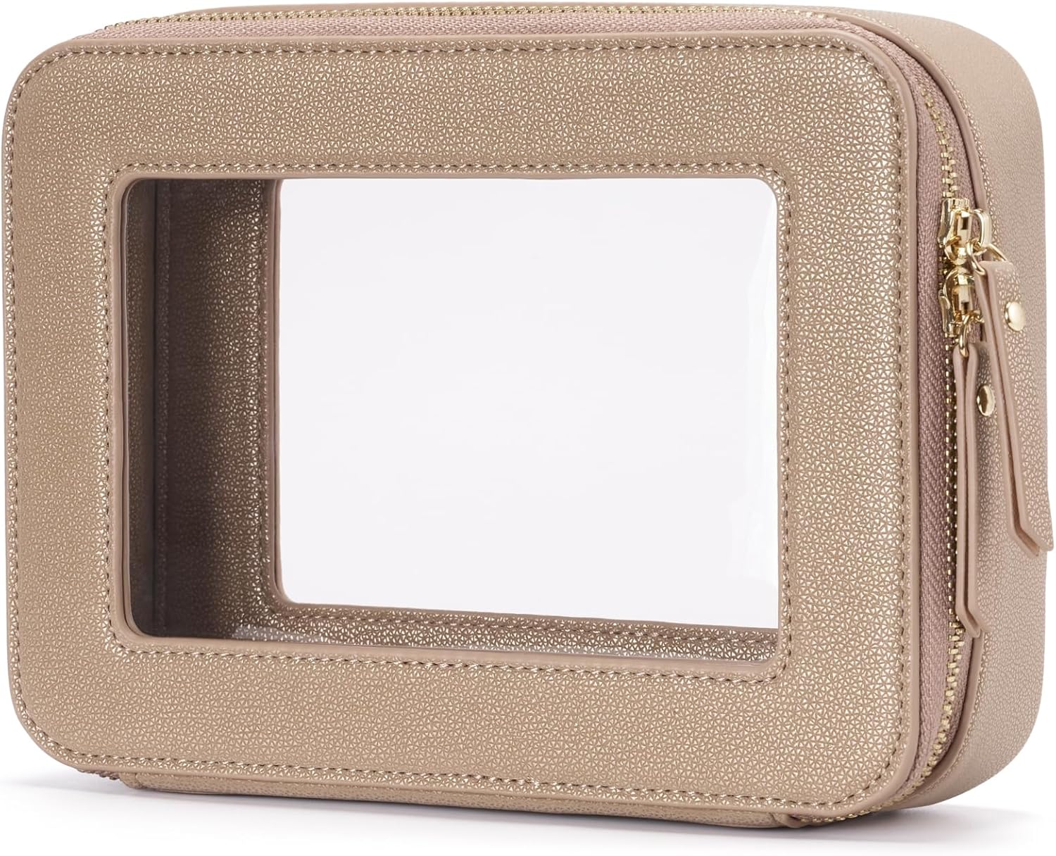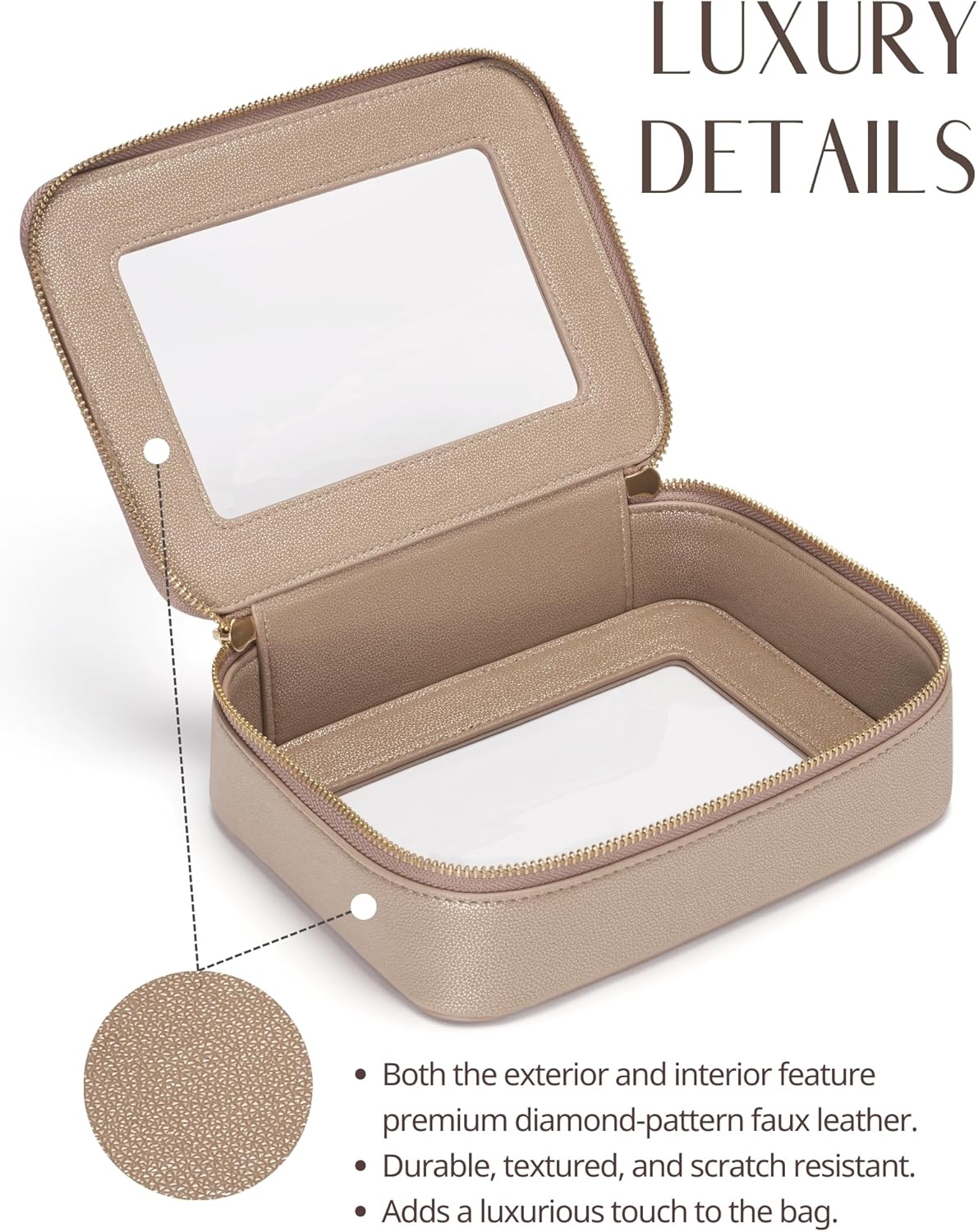 • [Premium Material and Durability] – The clear cosmetic case, both the exterior and interior, is crafted from high-grade diamond-pattern faux leather, which is highly scratch resistant, durable and exceptionally easy to keep clean. It features a smooth zipper for secure closure, and elegant light gold metal hardware accents, adding a luxurious and sophisticated touch to the bag's overall design.