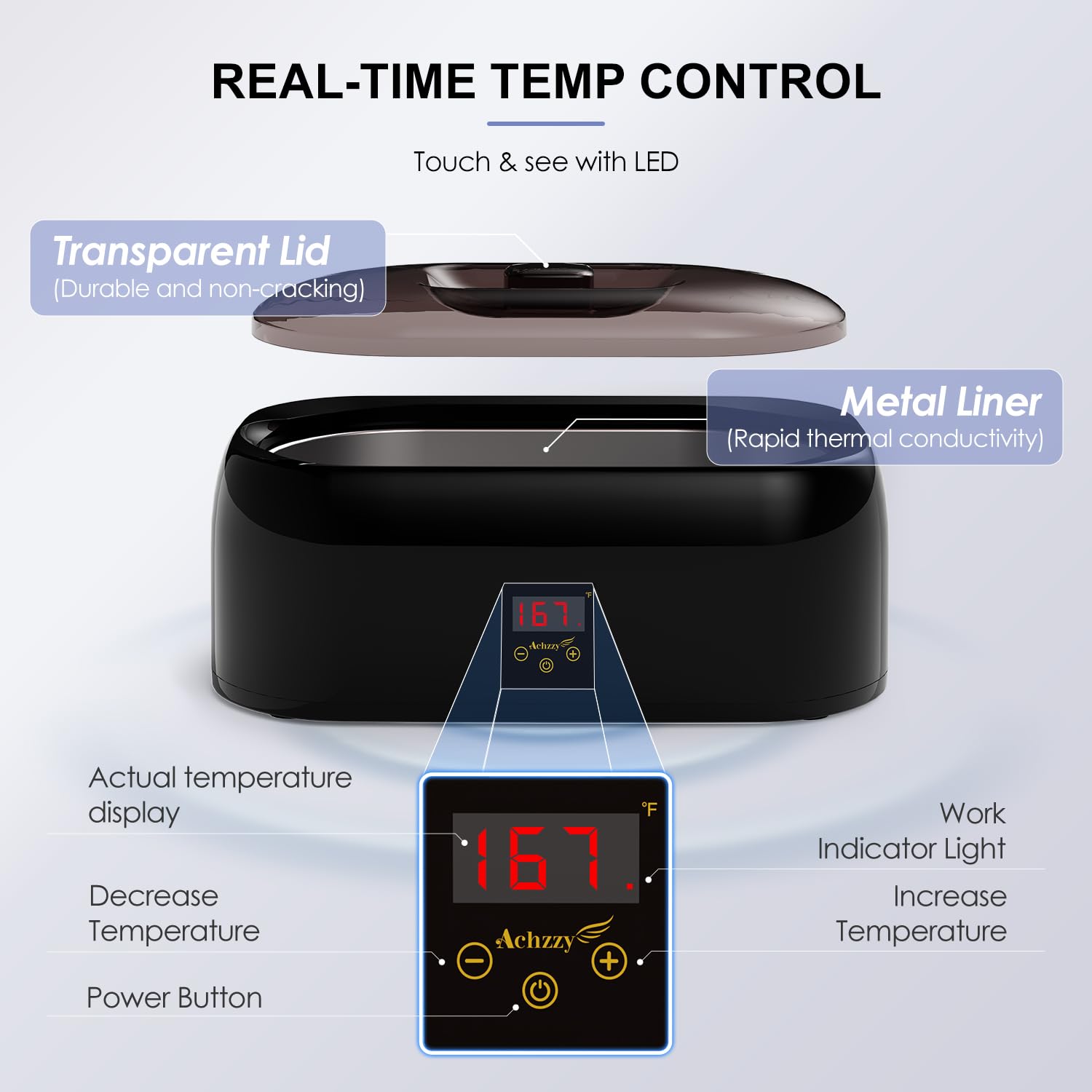 • PROFESSIONAL 200W THERMAI CORE FOR RAPID WAX MELTING - Featuring a powerful 200W energy-efficient heating core, the Achzzy paraffin wax machine provides efficient and consistent heating for rapid wax melting. With a maximum temperature of 167°F, Achzzy wax warmer can quickly melt paraffin wax in just 20 minutes, making it a highly practical tool for those who need to complete hand and foot care treatments quickly.