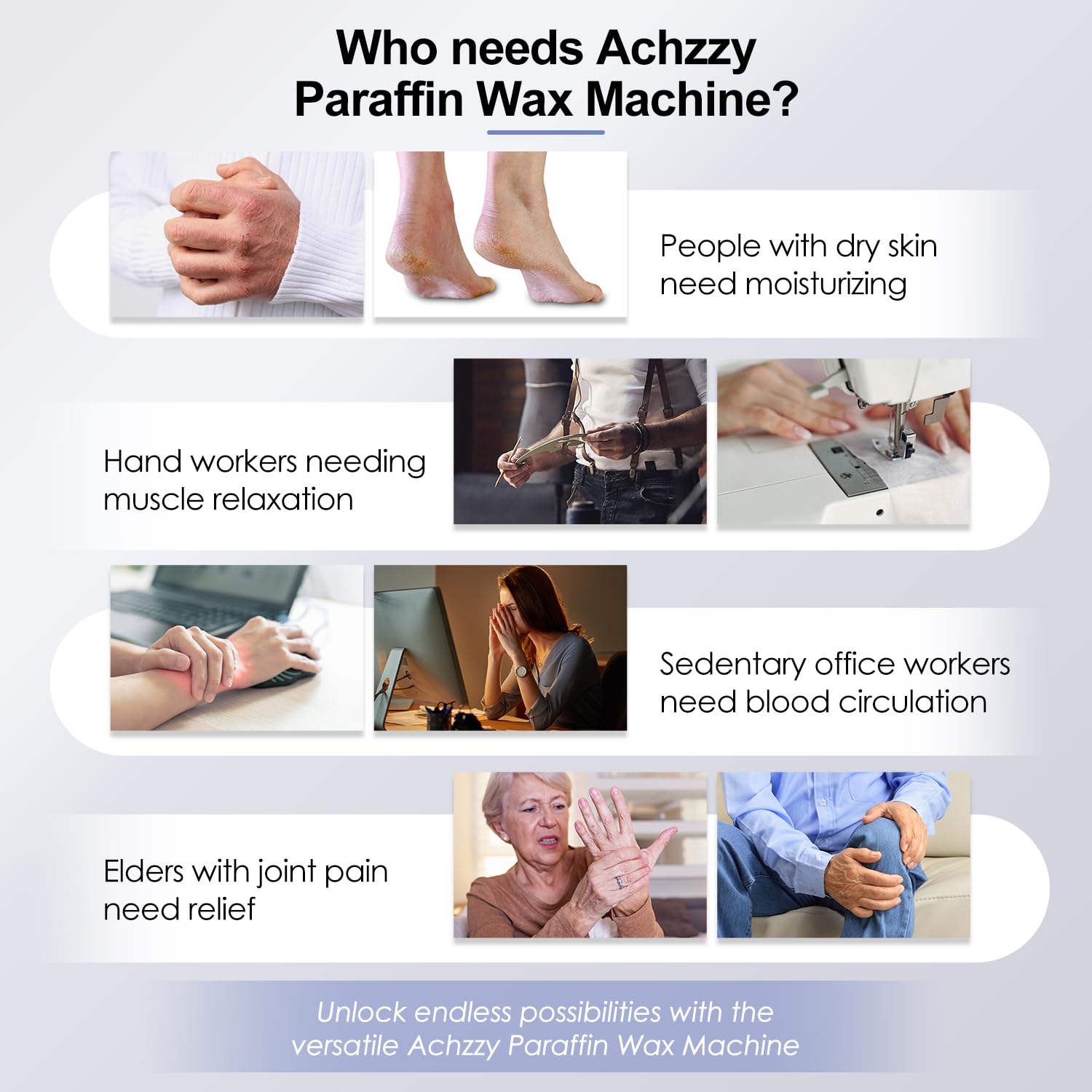 • DEEP MOISTURIZING TREATMENT FOR HANDS AND FEET–Designed for professional-quality care, the Achzzy paraffin bath deeply hydrates and nourishes your skin, leaving your hands and feet feeling soft, smooth, and rejuvenated after each use.
