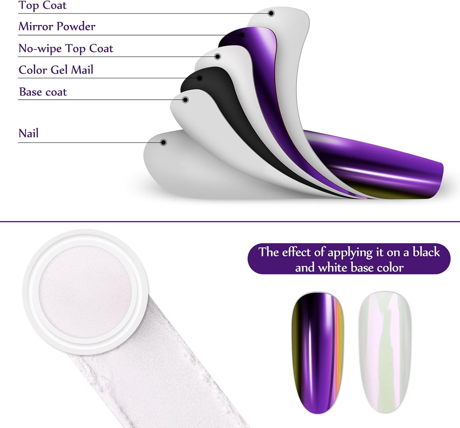 • 【The Scope Of Application】:All chrome powders should only be applied to glossy No wipe top coat to embellish Nail-Polishes color. Otherwise it is unusable, it can't be applied directly to the nail, and it can't be applied directly to the skin. Artdone chrome powder can be applied on UV gel nails, acrylic nails or false nail tips. You can use them very easily