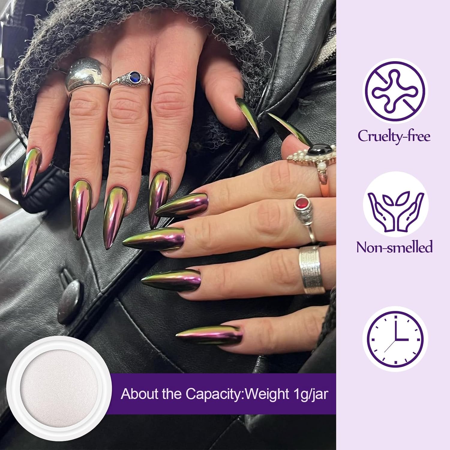 • 【QUALITY AND QUANTITY】 :The jar has 1 gram of powder, instead of just a little bit per jar. Artdone chrome nail powder has very good shining mirror effect, it can make different effects with different background colors. And they are great to go over light gel polishes without it changing the color too much