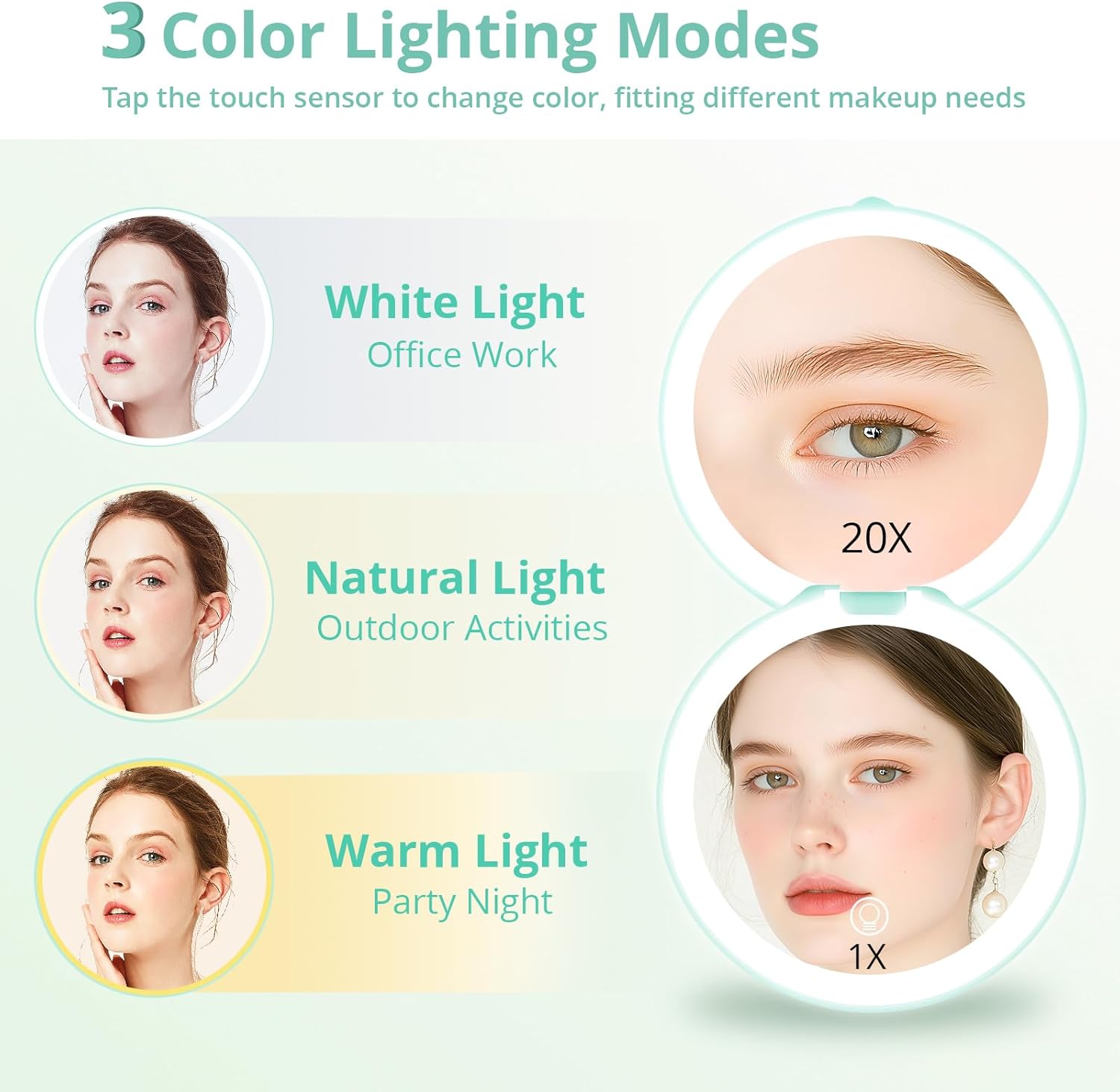 • Double Sided Lighted Mirror with 1x/20x: Upgraded compact mirror provides lighting for both mirror sides. 20x magnified mirror make you more efficient in doing face beauty, checking skin and hair style, and eyelash makeup