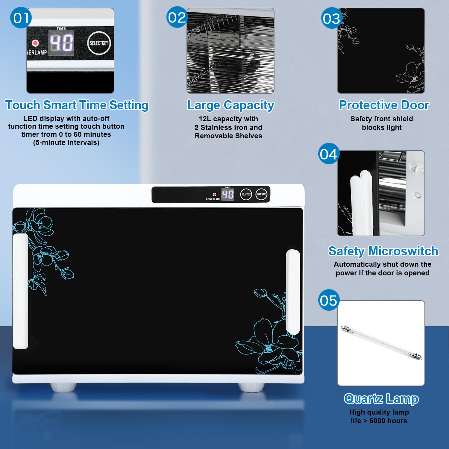 • βœ… π’πšπŸπžπ­π² 𝐚𝐧𝐝 𝐈𝐧𝐭𝐞π₯π₯𝐒𝐠𝐞𝐧𝐭: The cleaner cabient uses light, not generate heat. In order to keep dangerous rays within and prevent unintentional exposure, the light cabinet has an insulated door and an auto shut-off system. Thickened coated glass door blocks most of the light, avoiding direct exposure to your eyes. Smart security switch sensing, the light will auto-off when the door open. Energy-efficient lamp of only 6W ensures low energy consumption for saving on your electric bill.