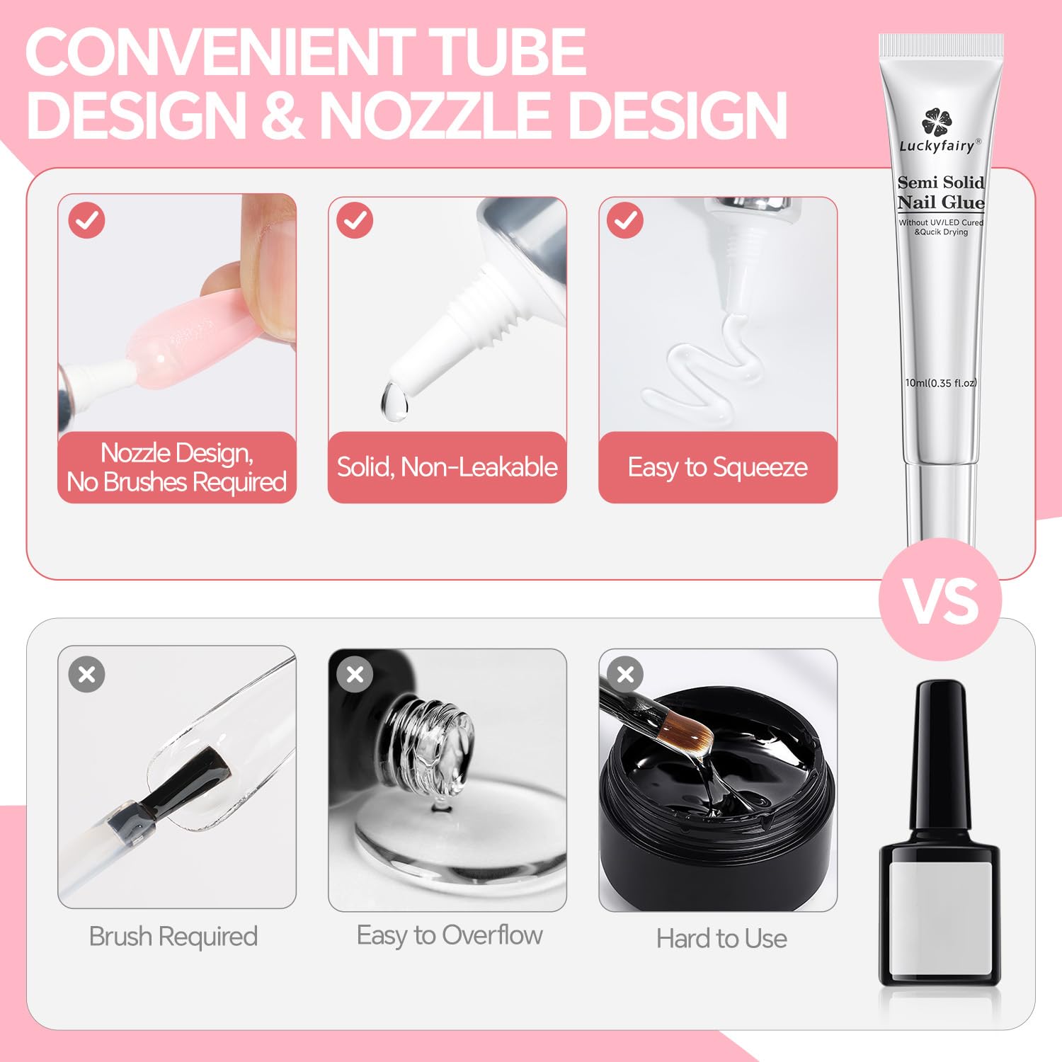 • Widely Used: Luckyfairy Semi Solid Nail Glue can safely stick clear nail tips, French nails, press-ons, and rhinestones for versatile DIY or salon use. Warm tips: No contact with water for one hour after use.