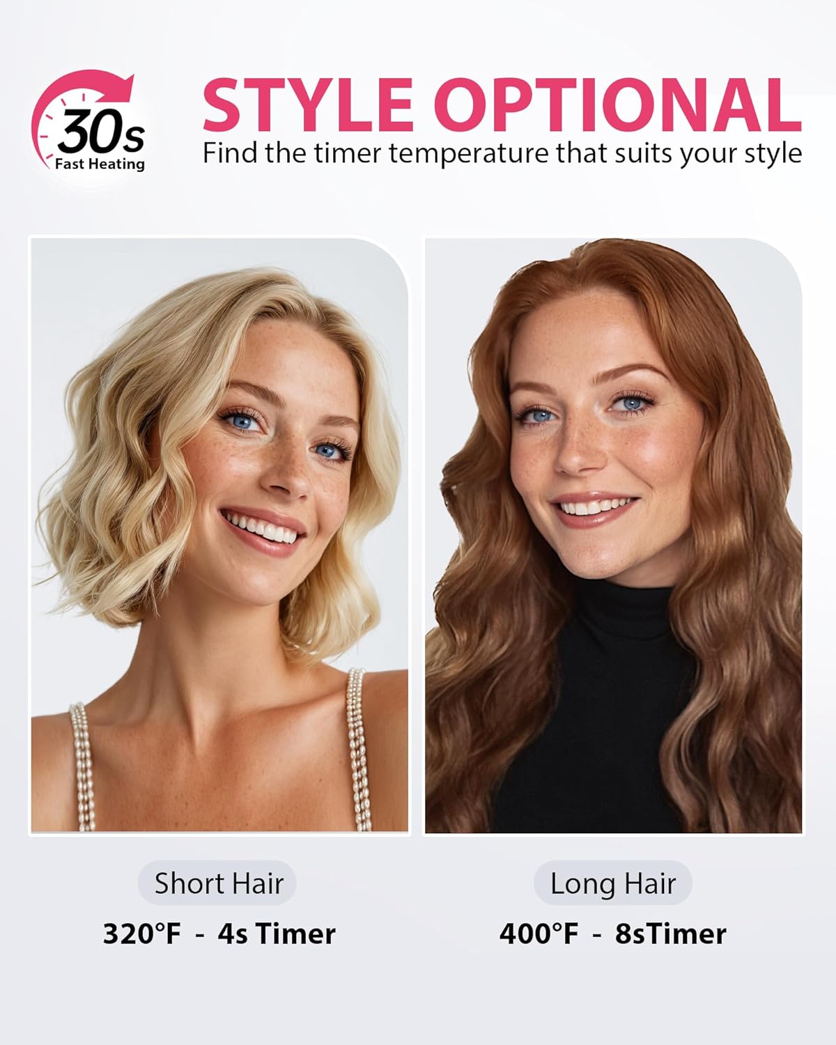• Ready in 30 Seconds - Style Faster: Don't wait! Our advanced PTC heating system gets your curling iron hot and ready for perfect waves in just 30 seconds. Achieve salon-worthy styles in no time. (Ultra-Fast Heating)