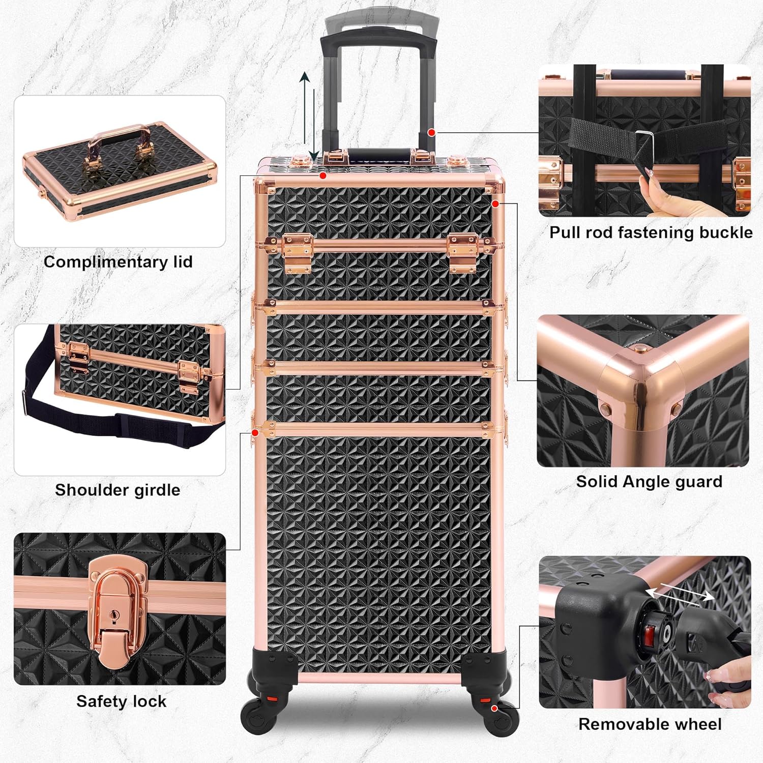 • 【Safety and Portability:】The makeup case organizer is secured with two locks on each layer, ensuring the safety of items with handles on the top. The telescopic handle is adjustable, meeting the needs of individuals of varying heights. The first layer of the case comes with a shoulder strap for separate use.